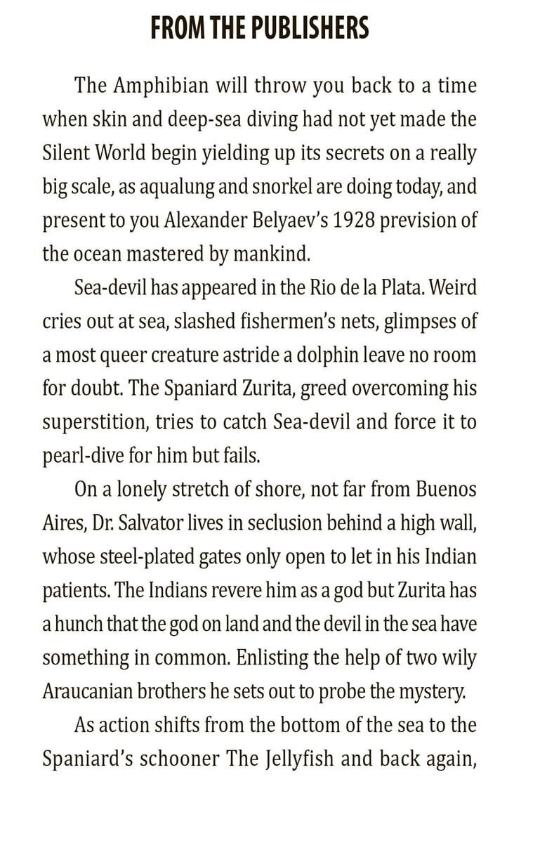 Этой книгой я пополнил коллекцию русских фантастических романов, переведенных на английский язык. Я, конечно, читал роман Беляева на русском языке. Английский же вариант мне интересен в качестве материала для тренировки. Такое чтение развивает навыки владения языком. Читая уже знакомый текст в переводе, получаешь представление, как правильно выражать свои мысли на иностранном языке. Как избегать буквализмов при переложении с русского на английский. Да и вообще это расширяет представления о языке. О языках. Ведь родной язык, русский начинаешь постигать тоньше, замечаешь то, на что раньше не обращал внимания. Проникаешь в саму «механику» языка, если можно так сказать, в то, как хитро сцеплены между собой его «шестерёнки».