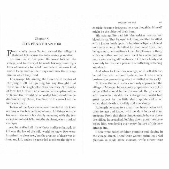 Это та самая первая книга про Тарзана. Хотите узнать, с чего начиналась его история, и проникнуться небывалым физическим и интеллектуальным (да-да, там даже довольно неодносложные, для парня из джунглей, фразы встречаются) превосходством этого благородного сына британских аристократов, полиглота, взращенного здоровенной страшной обезьяной? Добро пожаловать! Быть может, эта "ширпотребная" книга и не шедевр мировой литературы, но читается хорошо и удовольствие доставляет, а что еще надо-то? К тому же, сам Тарзан к настоящему времени - часть мирового культурного наследия. Разве же не интересно, откуда он взялся?