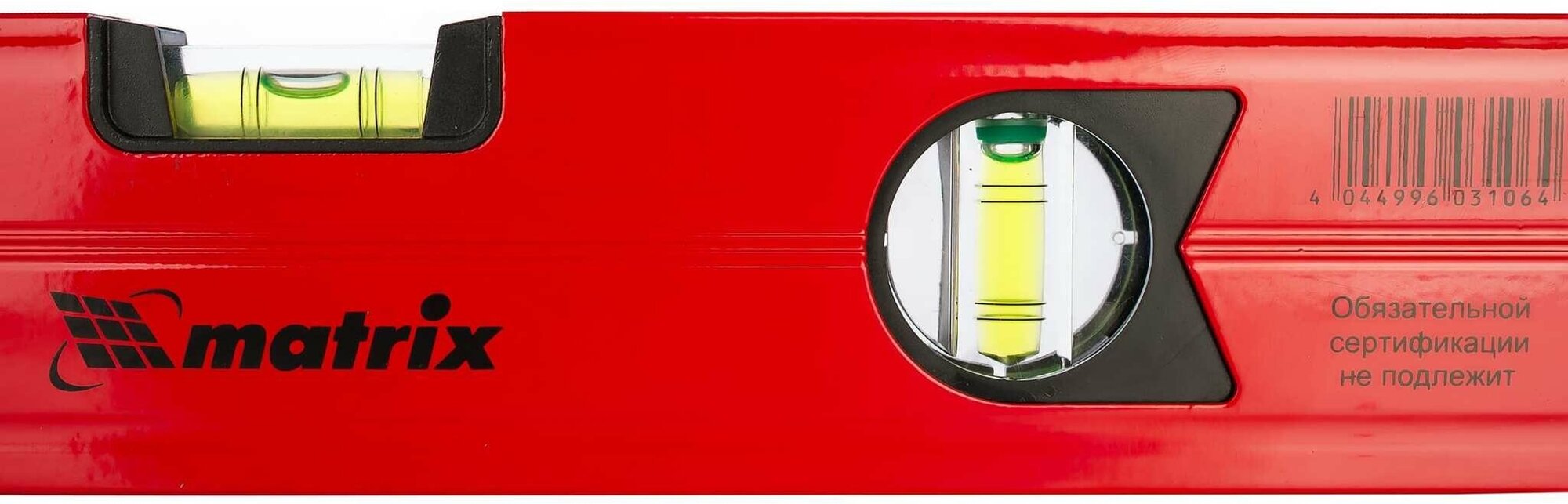 Строительный уровень Matrix с фрезерованной поверхностью алюминиевого корпуса получил подошву со встроенным магнитом, за счет которого он уверенно удерживается на металлических поверхностях, угол отклонения которых вы хотите проверить. Снабженный ребрами жесткости корпус уровня устойчив к механическим воздействиям. На концах корпуса изделия предусмотрены пластмассовые вставки.