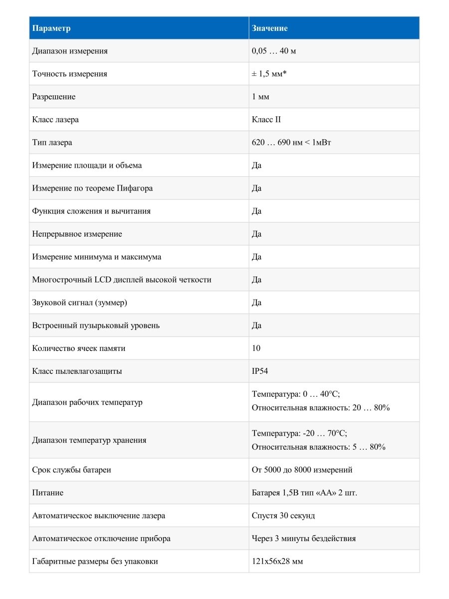 *При неблагоприятных условиях измерения (слишком яркое естественное освещение, слишком низкий или высокий коэффициент отражения поверхности в конечной точке) погрешность может увеличиться!