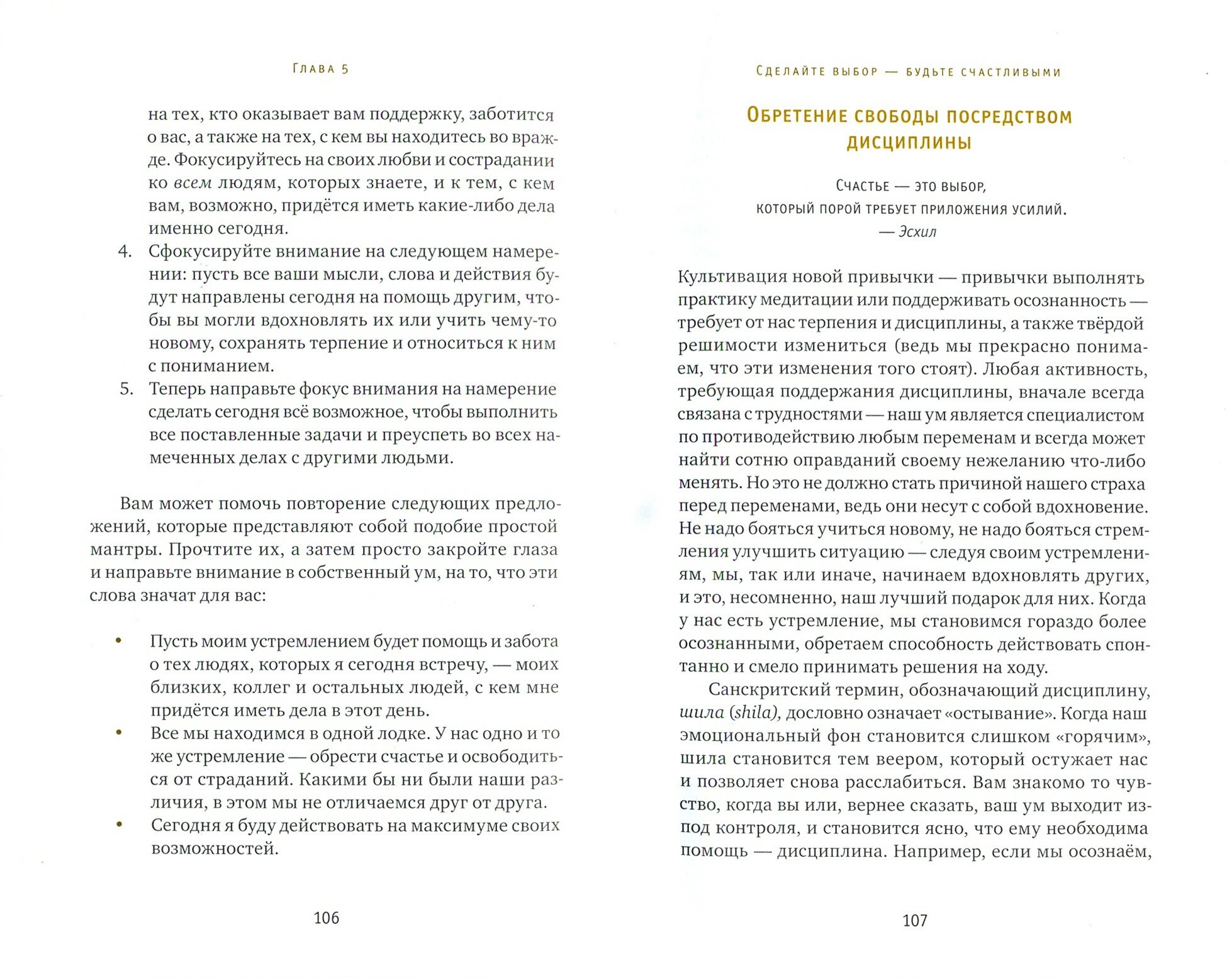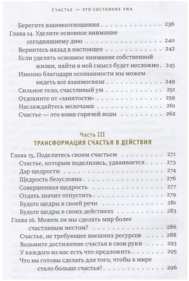 В книге автор устраняет заблуждения, заслоняющие истинный смысл счастья. Она указывает нам на препятствия и раскрывает методы, позволяющие развить позитивное отношение к этим препятствиям и тем самым их преодолеть. Эта книга послужит руководством, которое поможет нам научиться принимать собственную жизнь такой, как она есть, вместо того, чтобы бесконечно подстраивать её под собственные желания.