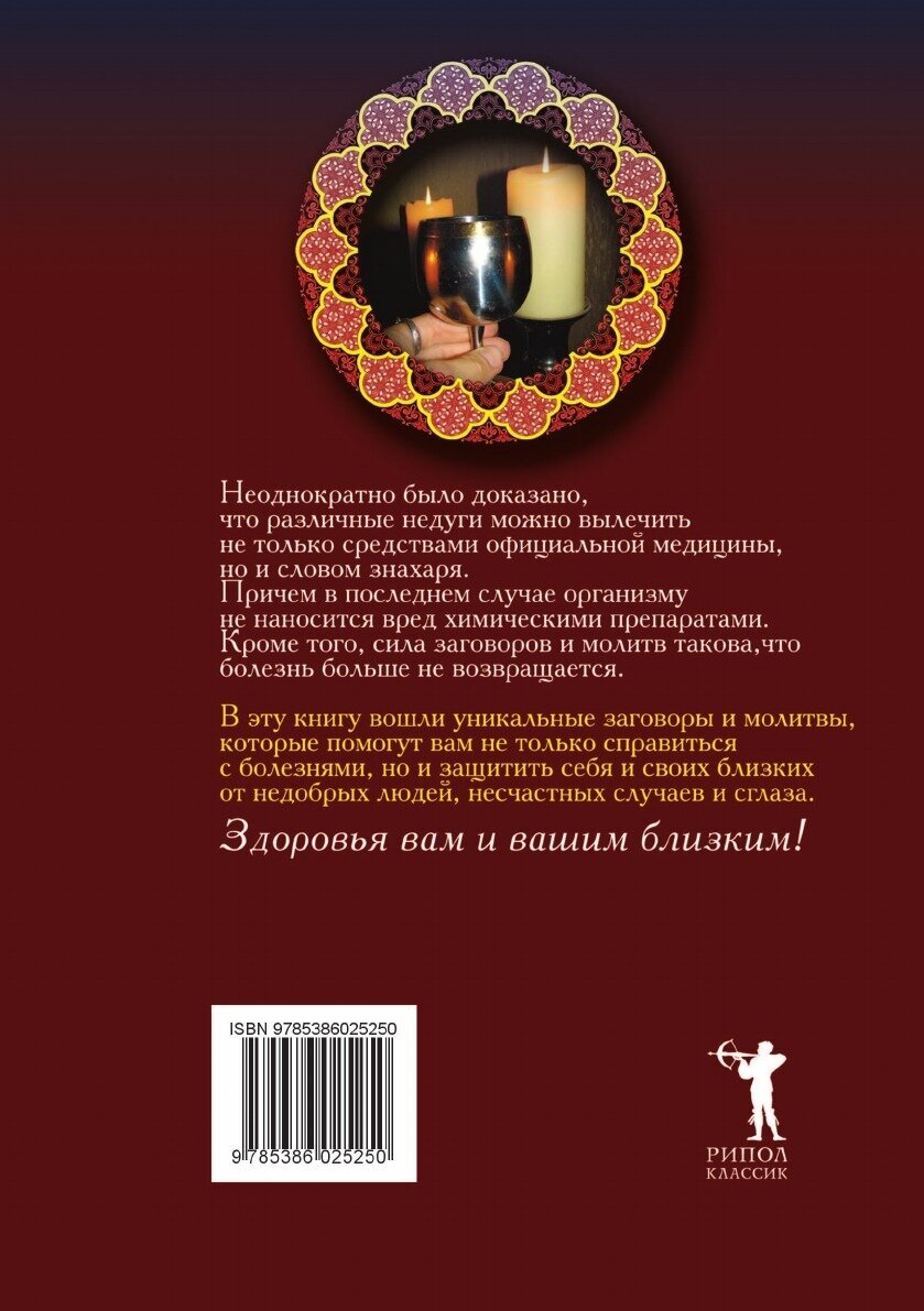 Неоднократно было доказано, что различные недуги можно вылечить не только средствами официальной медицины, но и словом знахаря. Причем в последнем случае организму не наносится вред химическими препаратами. Кроме того, сила заговоров и молитв такова, что болезнь не возвращается. В эту книгу вошли уникальные заговоры и молитвы, которые помогут вам не только справиться с болезнями, но и защитить себя и своих близких от недобрых людей, несчастных случаев и сглаза. Здоровья вам и вашим близким!