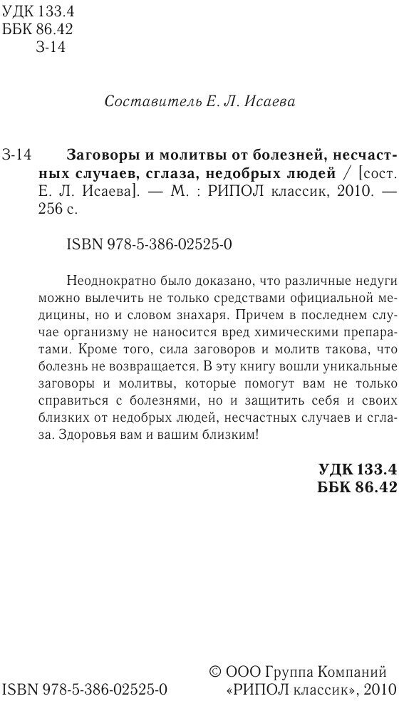 Заговоры и молитвы от болезней несчастных случаев сглаза недобрых людей (Исаева Елена Львовна); Рипол-Классик, 2010