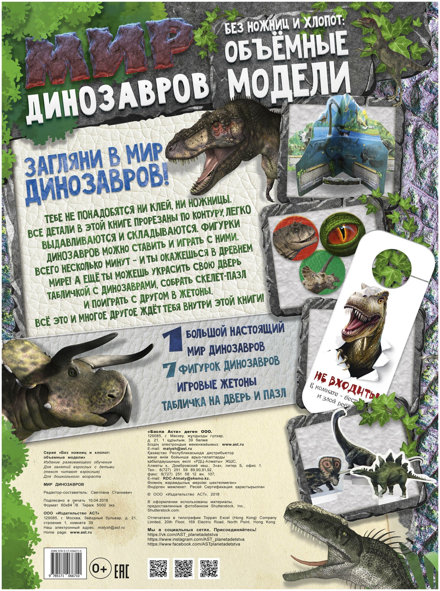 Тебе не понадобятся ни клей, ни ножницы. Все детали в этой книге прорезаны по контуру, легко выдавливаются и складываются. Фигурки динозавров можно ставить и играть с ними. Всего несколько минут - и ты окажешься в древнем мире. А еще ты можешь украсить свою дверь табличкой с динозаврами, собрать скелет-пазл и поиграть с другом в жетоны. Все это и многое другое ждет тебя внутри этой книги.