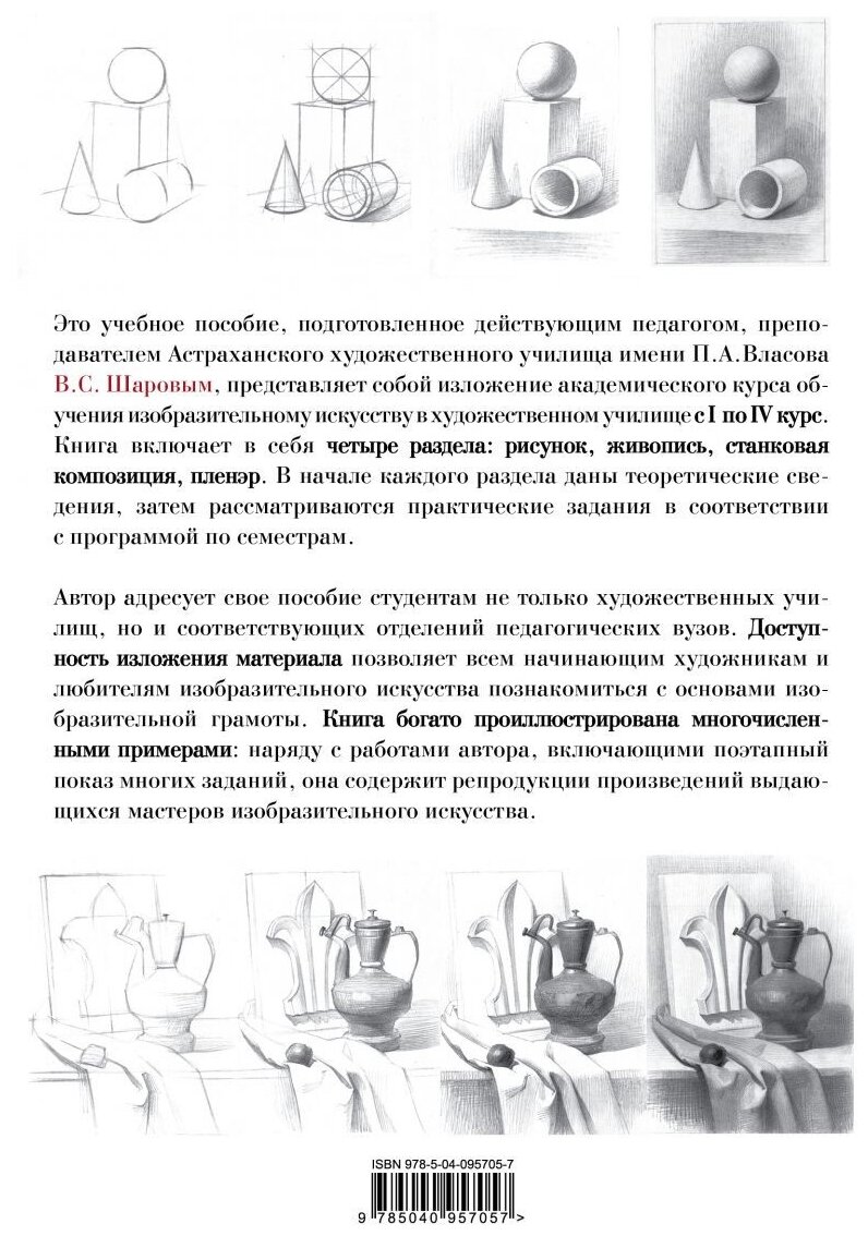 В пособии изложены законы и понятия из комплекса теоретических знаний, важных для овладения изобразительной грамотой. Пособие включает в себя систематическое иллюстрированное изложение академического курса по рисунку, живописи, станковой композиции и пленэру на основе программ по этим дисциплинам, разработанных методическим кабинетом Московского государственного академического художественного училища памяти 1905 года для отделения "Живопись" художественных училищ и рекомендуемых Министерством культуры РФ.