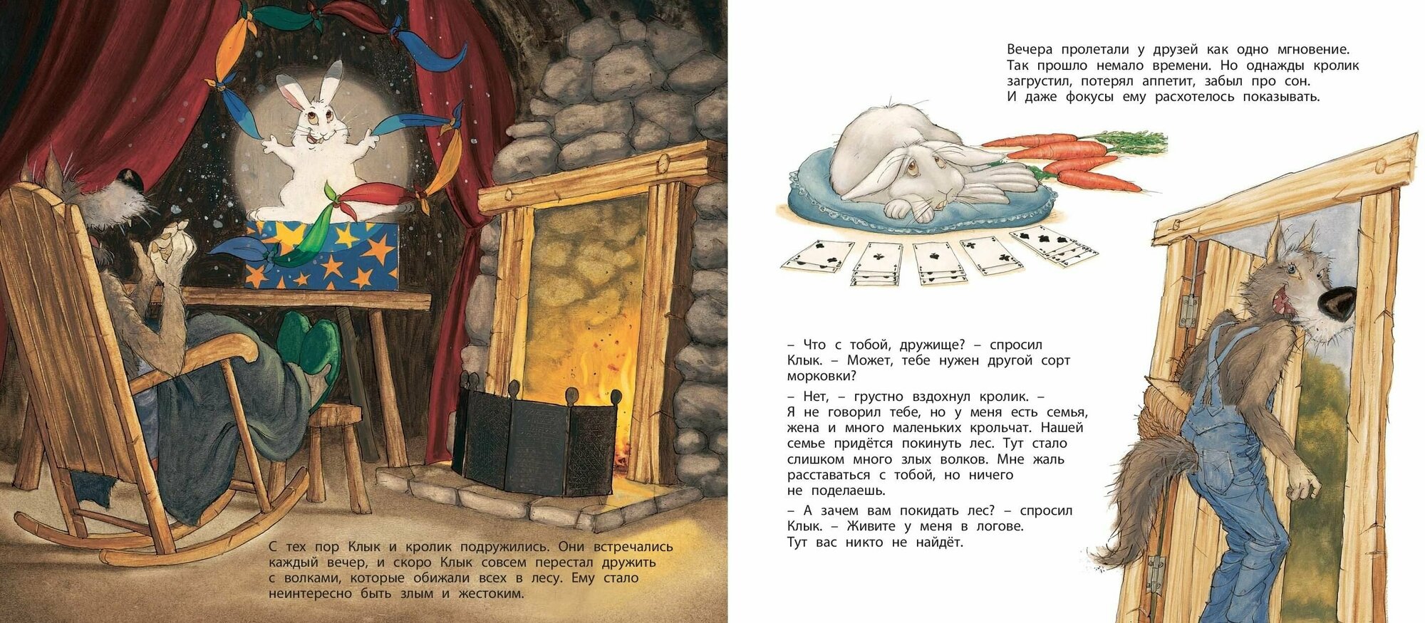Жил-был в лесу маленький кролик, который умел показывать волшебные фокусы. Даже злой волк, глядя на них стал добрым и весёлым. Забавную историю о том, как злой волк благодаря дружбе с кроликом превратился в доброго фокусника, написала известная бельгийская писательница Лоранс Бургиньон, а иллюстрировал ее соотечественник, художник Мишель Деруйё. Их творчество знакомо нашим читателям по книжке "Наперегонки с черепахой".