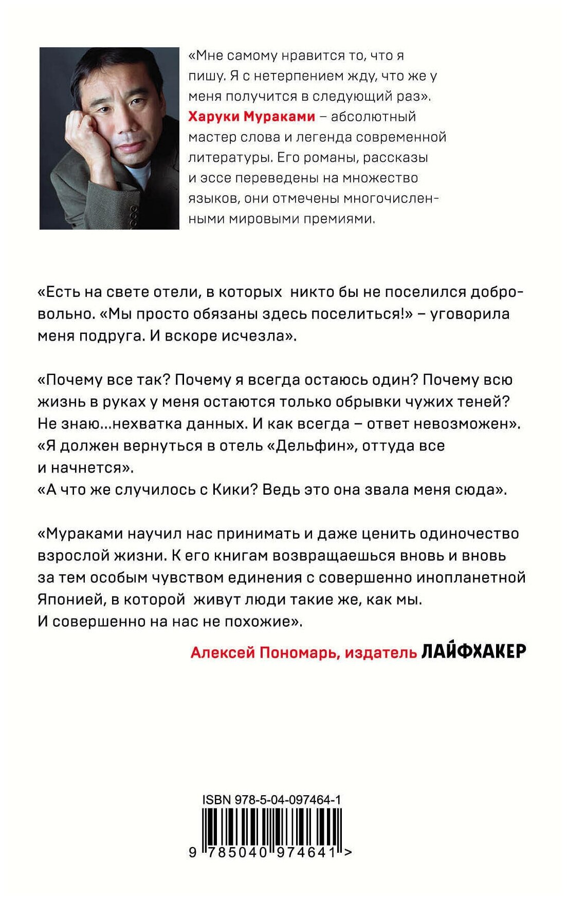Харуки Мураками снова выставил себя главным героем своей книги. Он рассказывает читателю о себе, своей жизни, друзьях и об отеле дельфин, который никак не даёт ему покоя. Вернувшись в отель, изменившийся до неузнаваемости он встречает давнего знакомого человека овцу и переходит на путь изменений в своей жизни. Как так вышло, что он сблизился с работницей отеля, однажды забредшей в мир Мураками, ввязался в семейные неурядицы тринадцатилетней девочки и потерял друга, у которого было все и ничего одновременно, вы узнаете из этой книги. От себя скажу, что раскрывая себя посредством тёмного мира, некоторых персонажей и сюжета, автор мастерски построил и детектив и мистику и любовную прозу в одной книге. Еестоит прочитать, все произведения Мураками неординарные по написанию и разговору с читателем, и за это он так любим многими