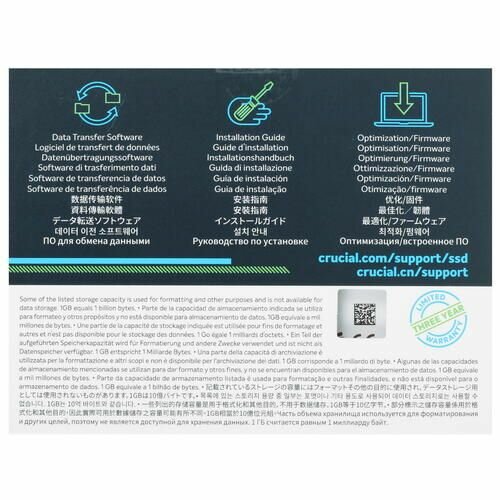 Для подключения к материнской плате в конструкции твердотельного накопителя Crucial предусмотрен интерфейс SATA III. Модель демонстрирует высокую степень надежности и обладает стойкостью к механическим, температурным и вибрационным воздействиям.