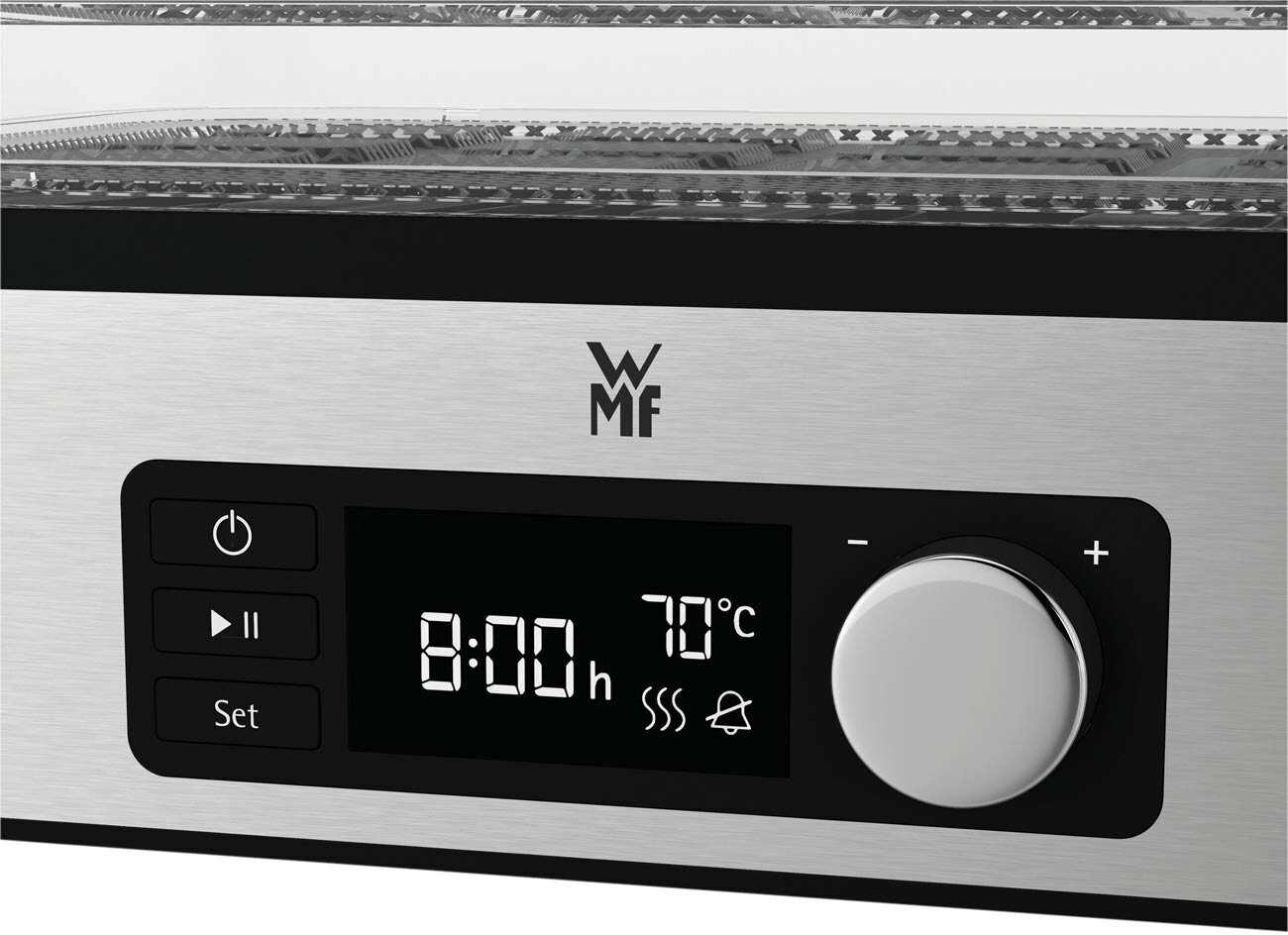 Сушка WMF оснащена 5-ю секциями для сушки овощей, фруктов, грибов, мяса, хлеба и т.д. Она оборудована электронным дисплеем с регулятором температуры от 30 до 70 градусов, а также таймером обратного отсчета с максимальным допустимым временем 24 часа.