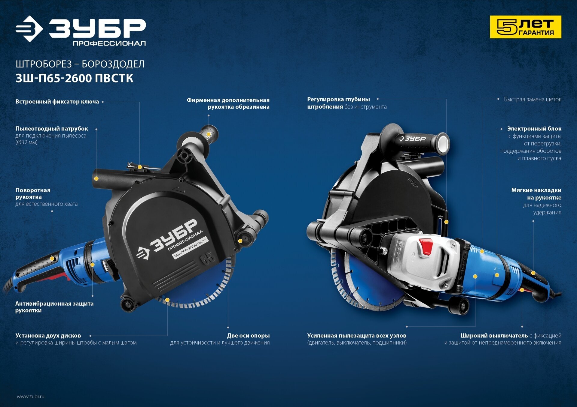Профессиональный штроборез Зубр для штробления и резки канавок в бетонных и кирпичных поверхностях. Быстрый рез на любую глубину благодаря увеличенной мощности двигателя. Эффективное пылеудаление исключает простои на проветривание пыли. Пониженный уровень вибраций в условиях даже предельных нагрузок за счет точной сборки и демпфированной рукоятки. Для наиболее тяжелой работы - самый мощный инструмент Наиболее мощная модель в линейке и одна из самых мощных на рынке.