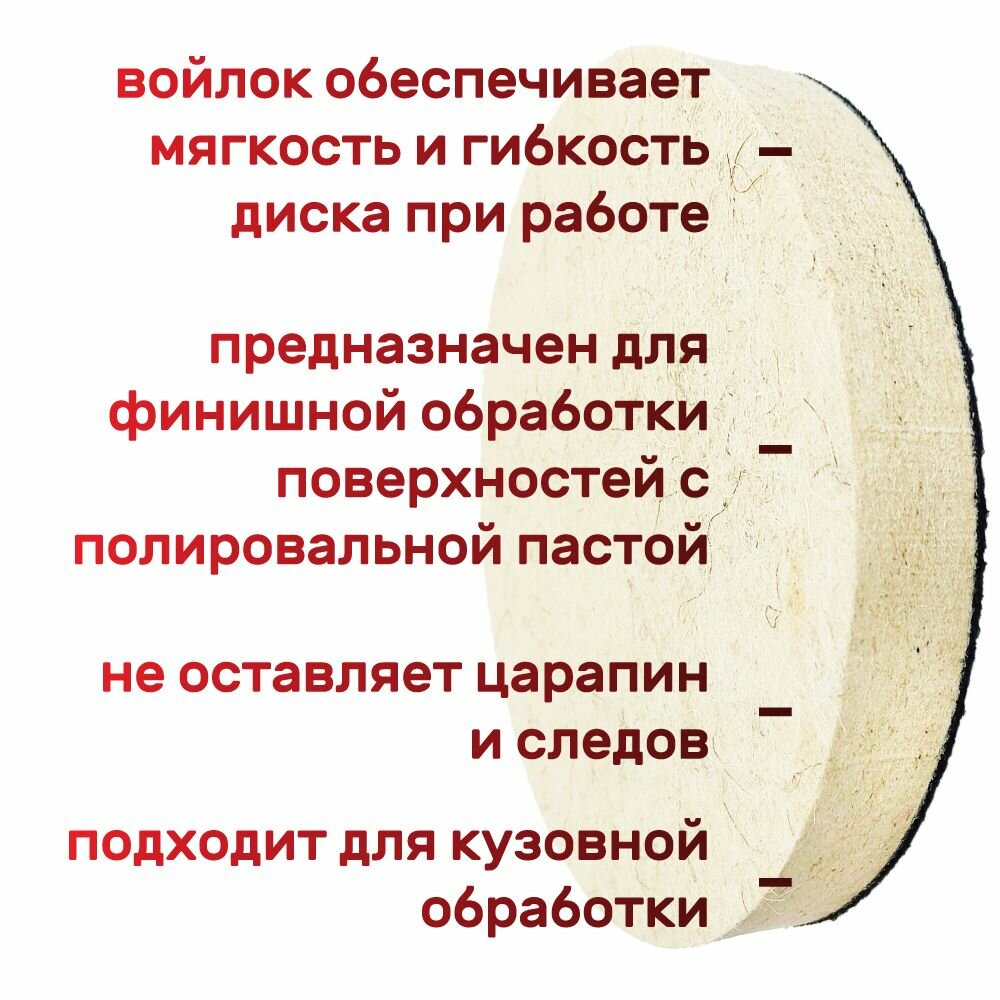 Особенности: - Предназначен для финишной обработки различных поверхностей; - Круг войлочный неабразивный для полировки металла, стекла, пластмасс с помощью полировальных паст; - Рабочая поверхность из войлока обладает высокой износостойкостью; - Полировка различных поверхностей (металл, камень, стекло, пластик, лак и т. д.) производится с применением полировальных паст или полиролей; - Применяется для дрелей, полировальных и шлифовальных машин с регулировкой оборотов. Технические характеристики: - Материал: войлок; - Тип войлока: Normal серый; - Крепление: на липучку (Velcro); - Применение: для для УШМ/полировальной машины/дрели; - Количество в упаковке: 1 шт; - Диаметр: 125 мм; - Толщина: 20 мм.