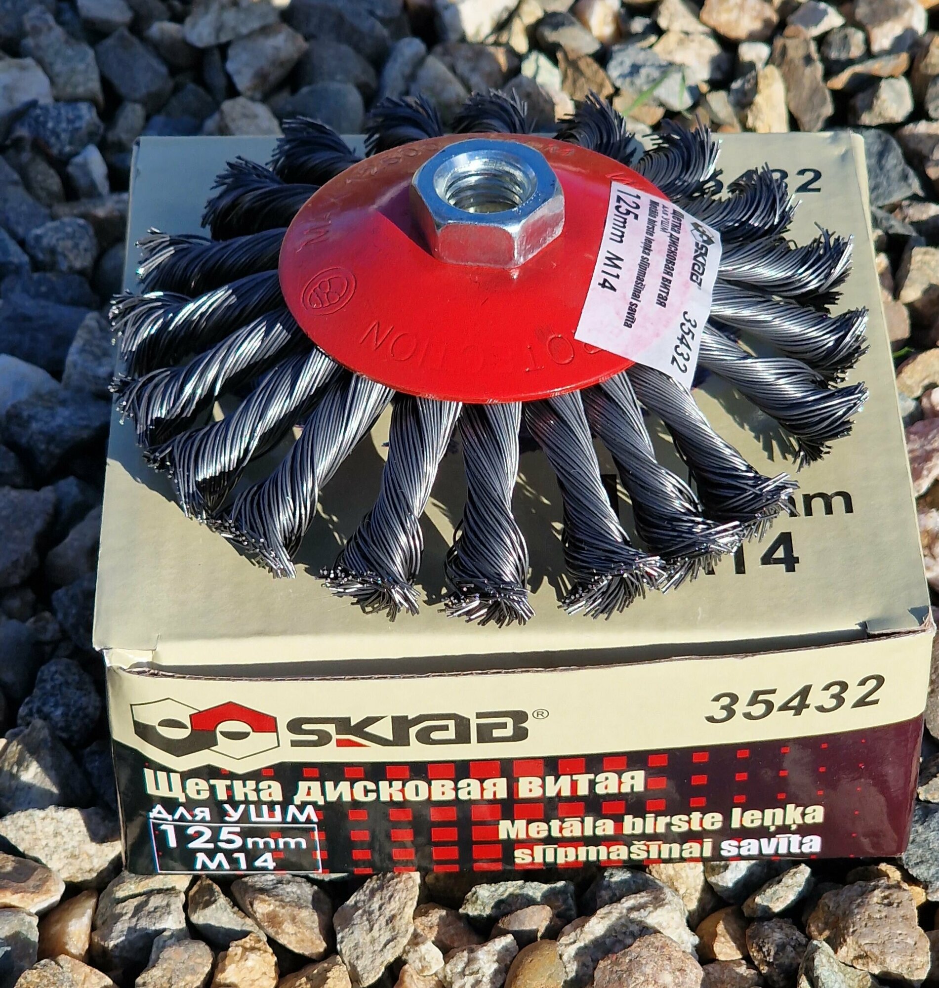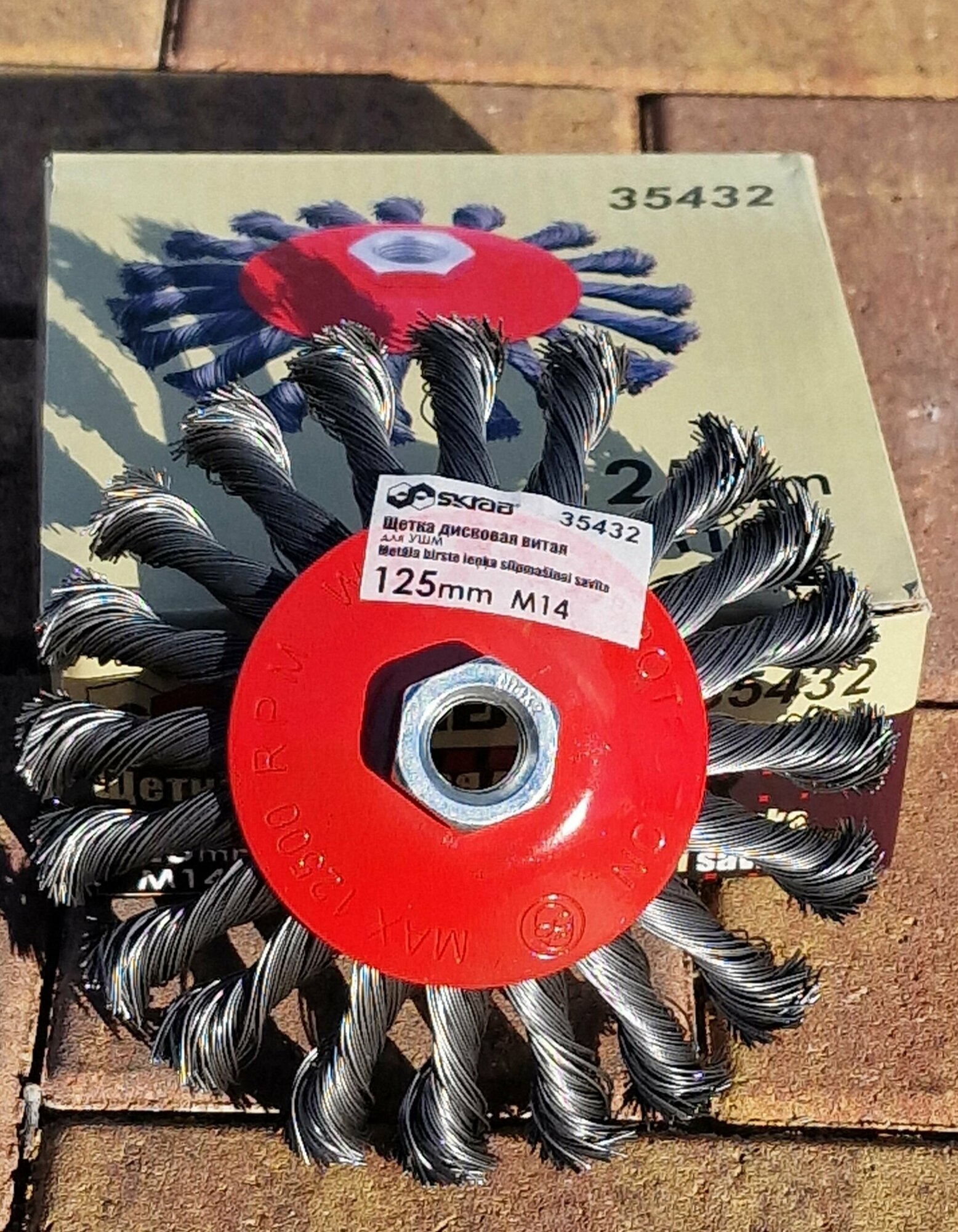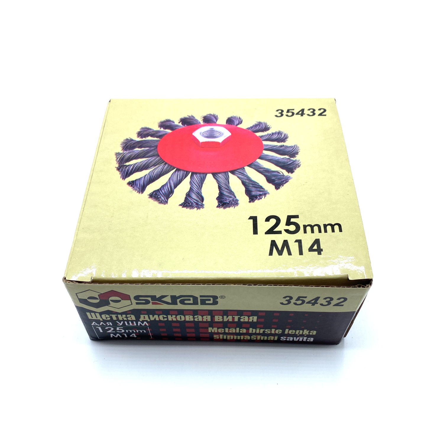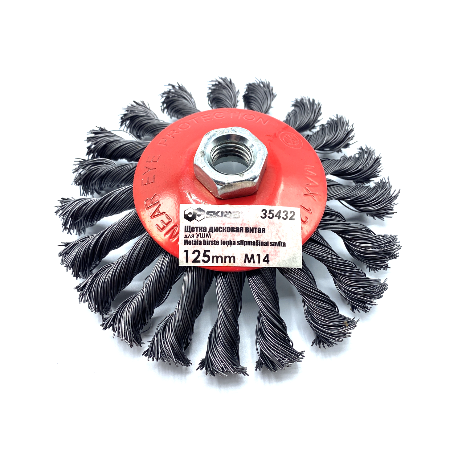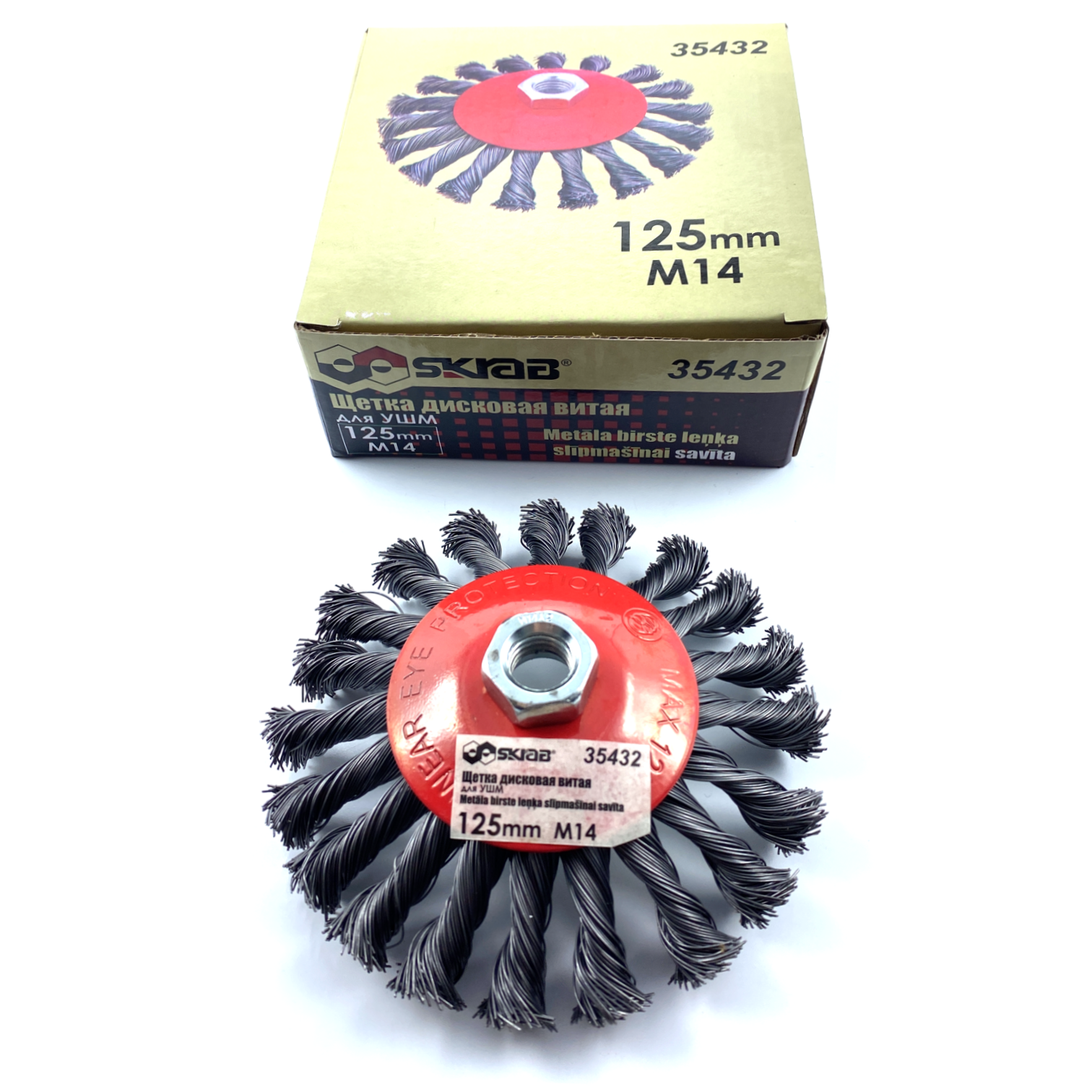 Арт. Щетка дисковая для УШМ (болгарки) витая 125мм, гайка М14 SKRAB. Размер диска:d 125мм. Корщетка изготовлена из высококачественной витой стальной проволоки. Диаметр проволоки 0,5мм. Максимальные обороты: 10000 об/мин.Используется в шлифовальных и отрезных машинах (УШМ) для удаления ржавчины, краски, лака, грунтовки с металлических поверхностей.