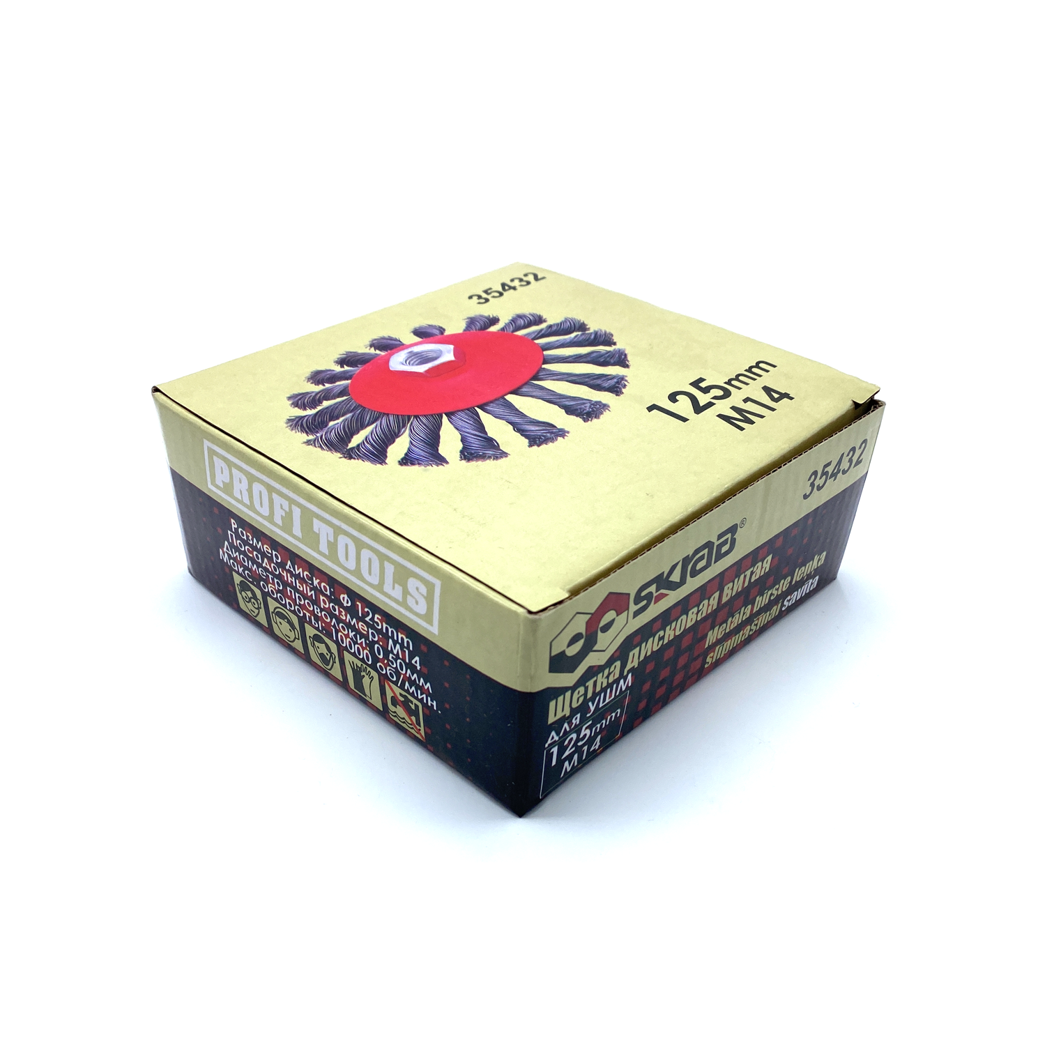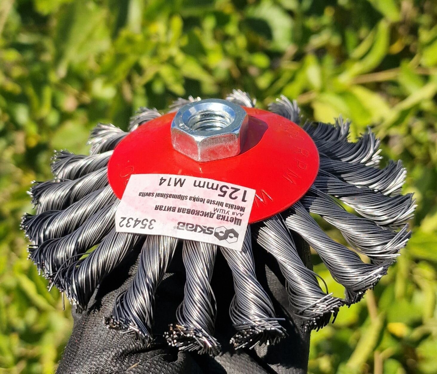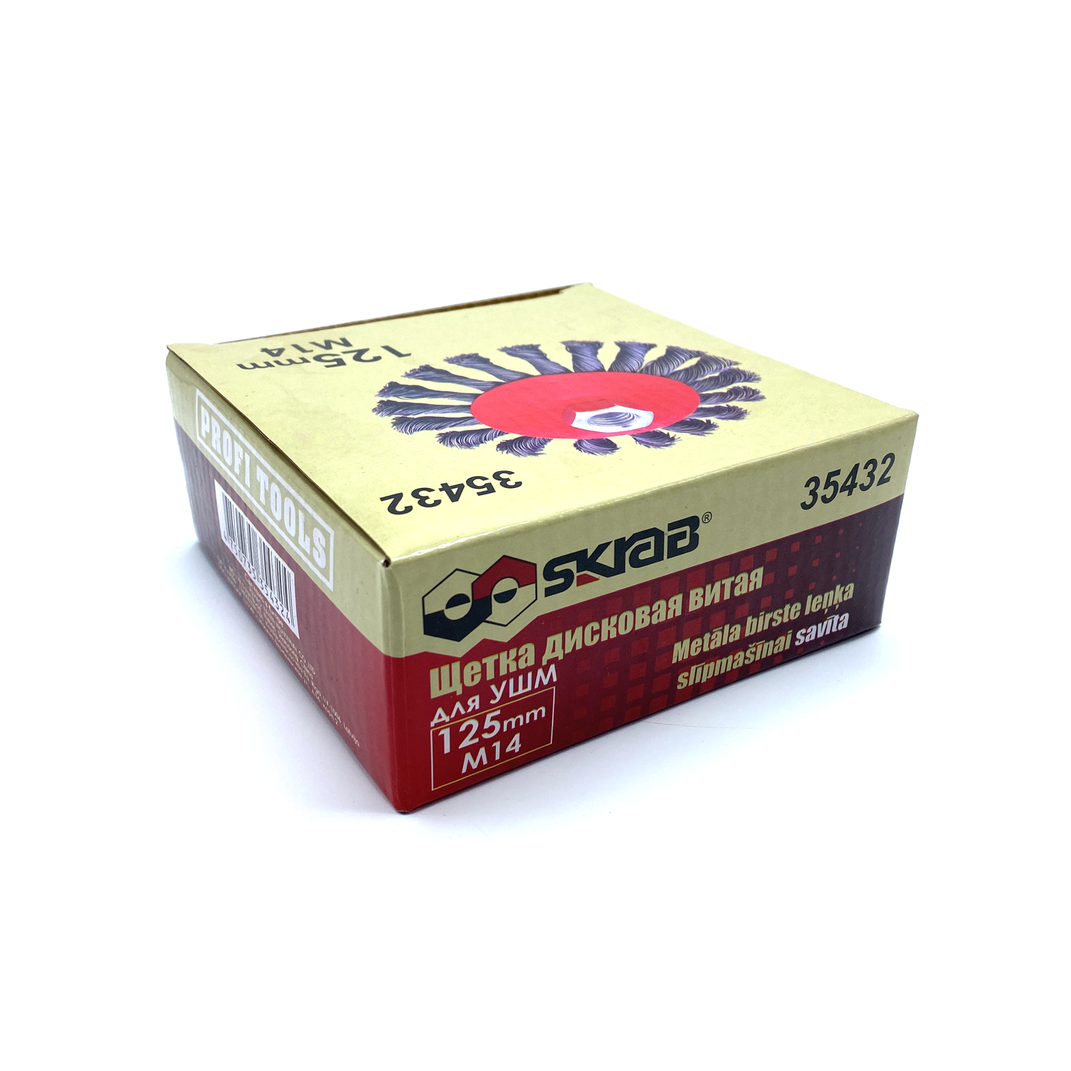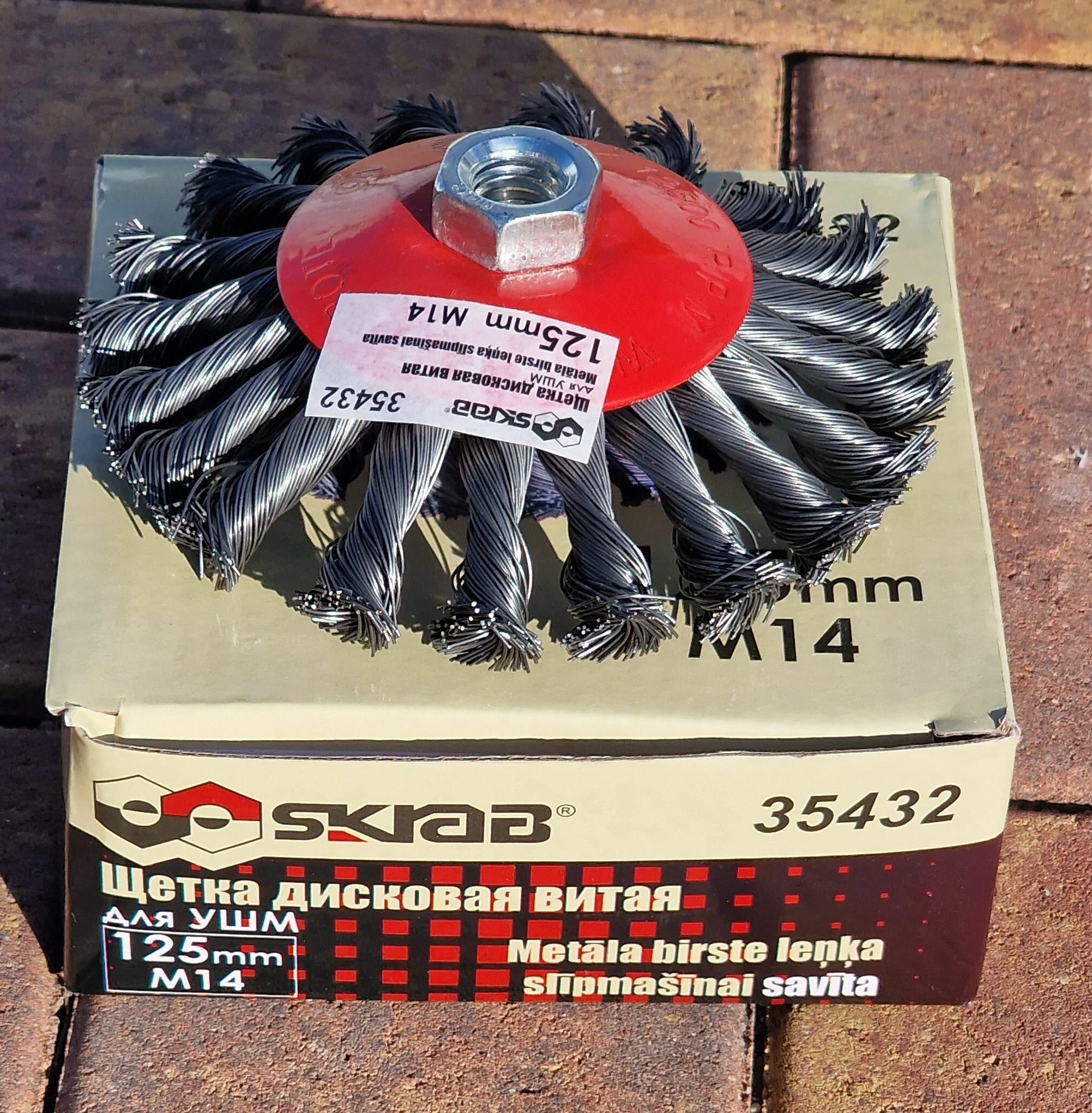 Арт. Щетка дисковая для УШМ (болгарки) витая 125мм, гайка М14 SKRAB. Размер диска:d 125мм. Корщетка изготовлена из высококачественной витой стальной проволоки. Диаметр проволоки 0,5мм. Максимальные обороты: 10000 об/мин.Используется в шлифовальных и отрезных машинах (УШМ) для удаления ржавчины, краски, лака, грунтовки с металлических поверхностей.