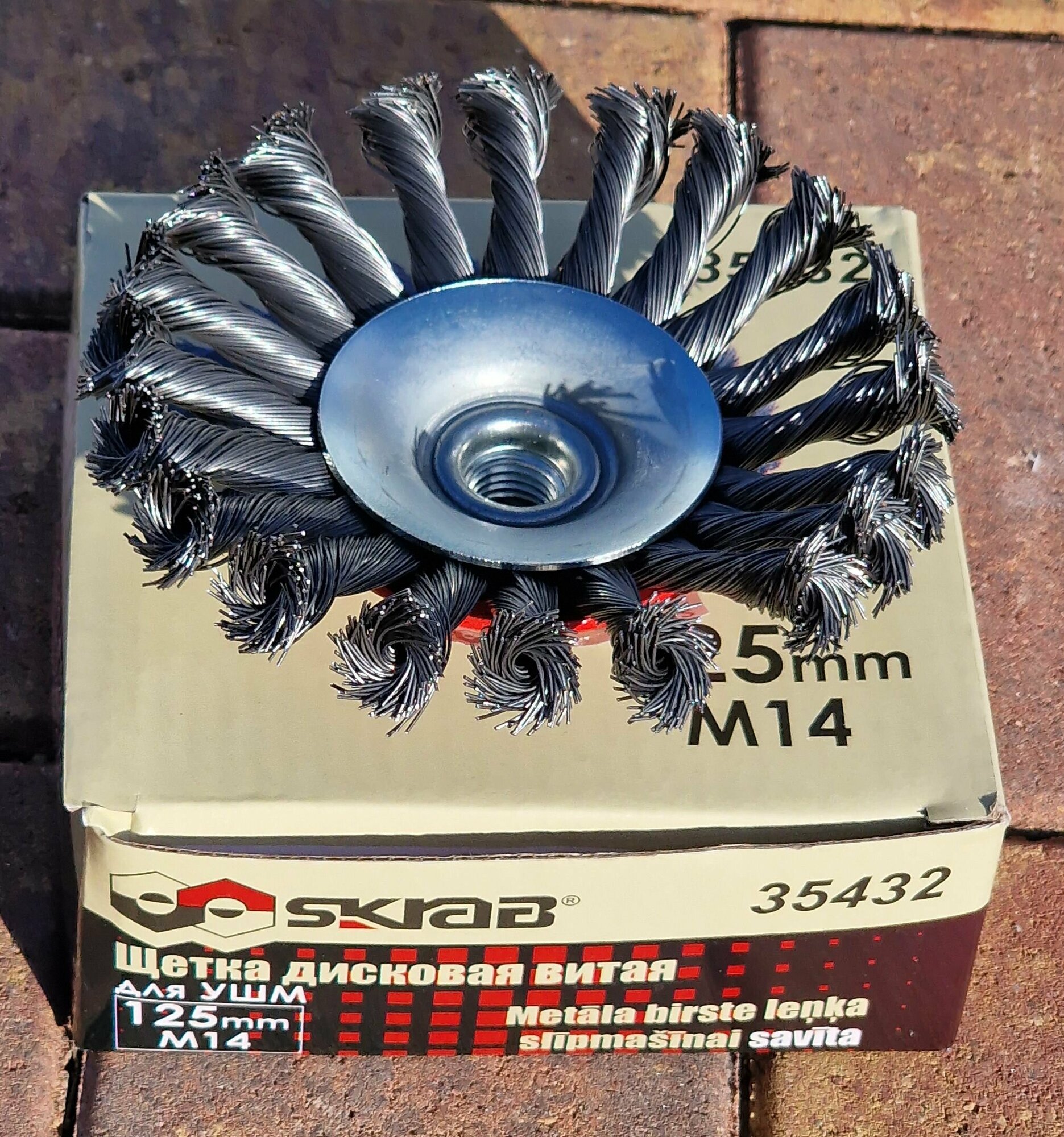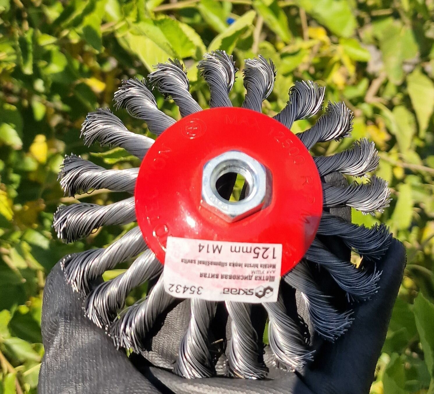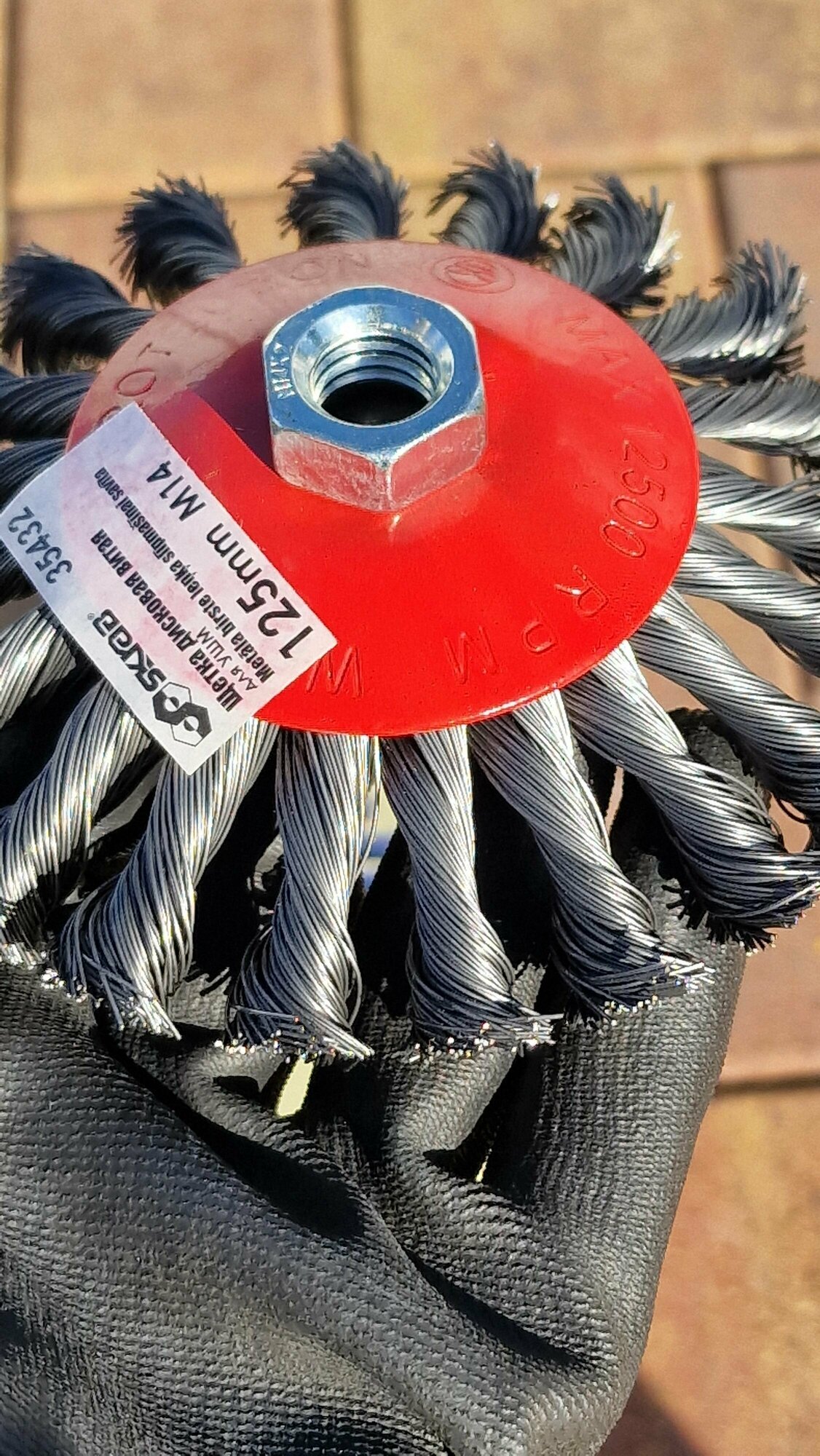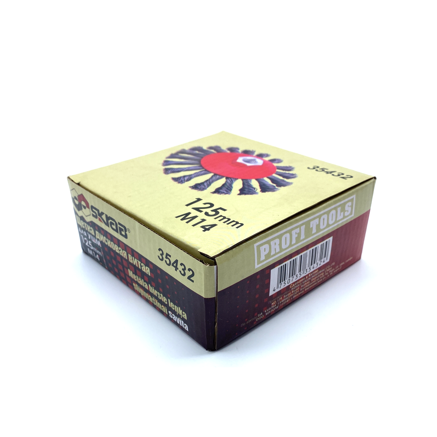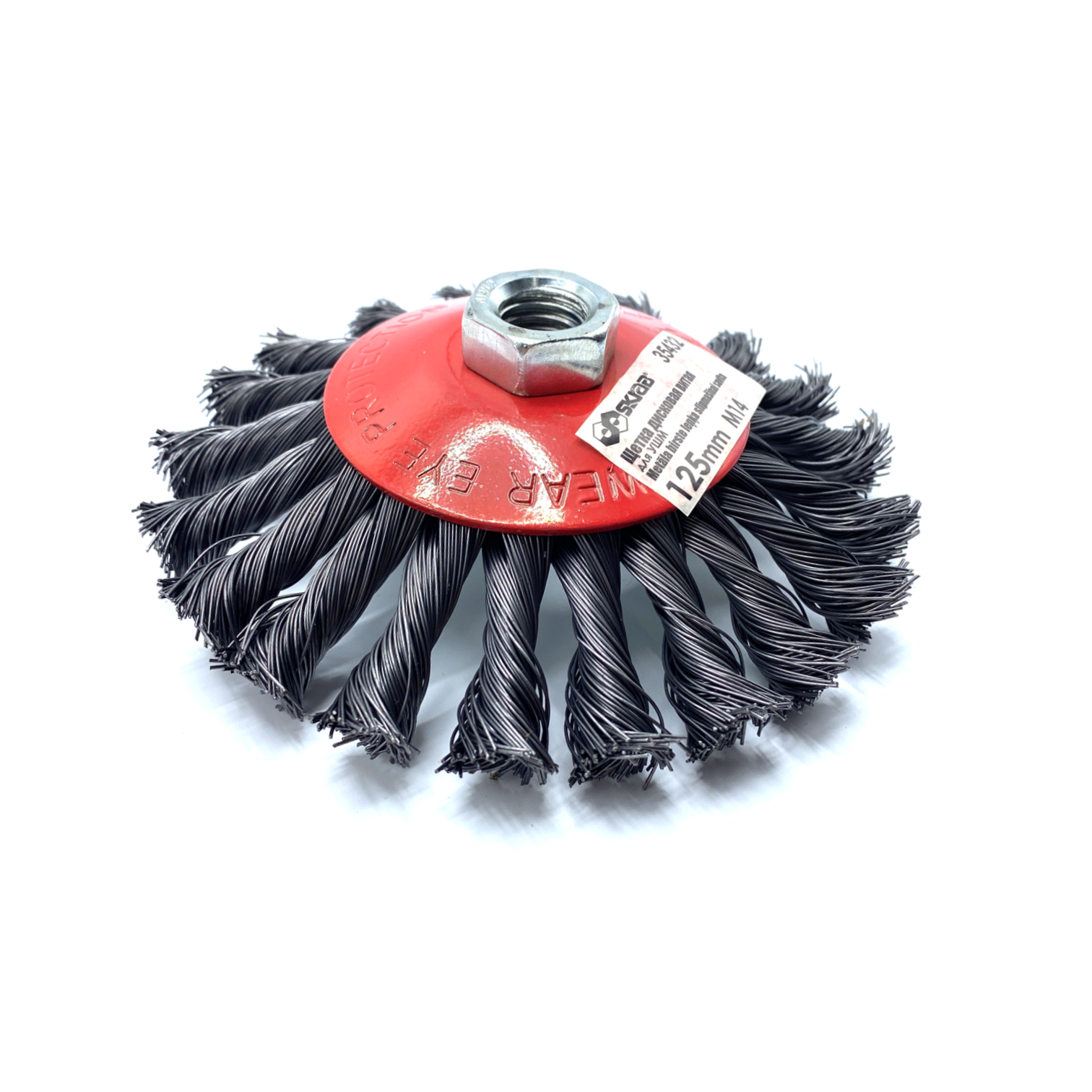 Арт. Щетка дисковая для УШМ (болгарки) витая 125мм, гайка М14 SKRAB. Размер диска:d 125мм. Корщетка изготовлена из высококачественной витой стальной проволоки. Диаметр проволоки 0,5мм. Максимальные обороты: 10000 об/мин.Используется в шлифовальных и отрезных машинах (УШМ) для удаления ржавчины, краски, лака, грунтовки с металлических поверхностей.