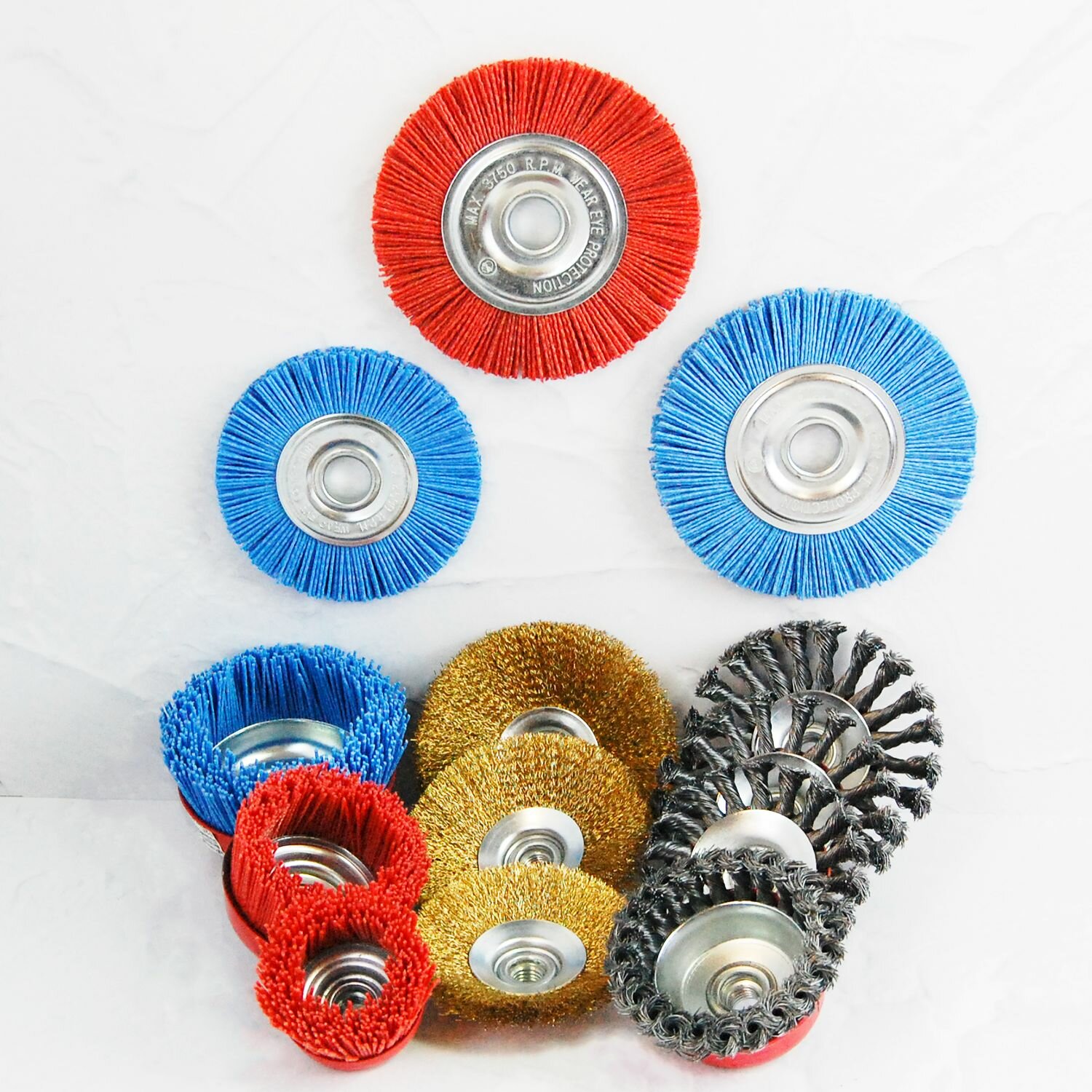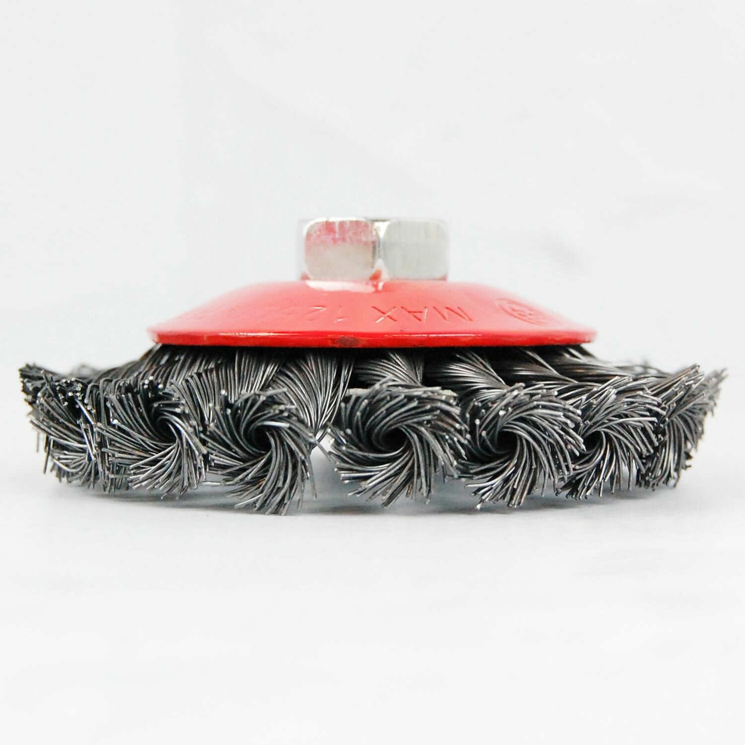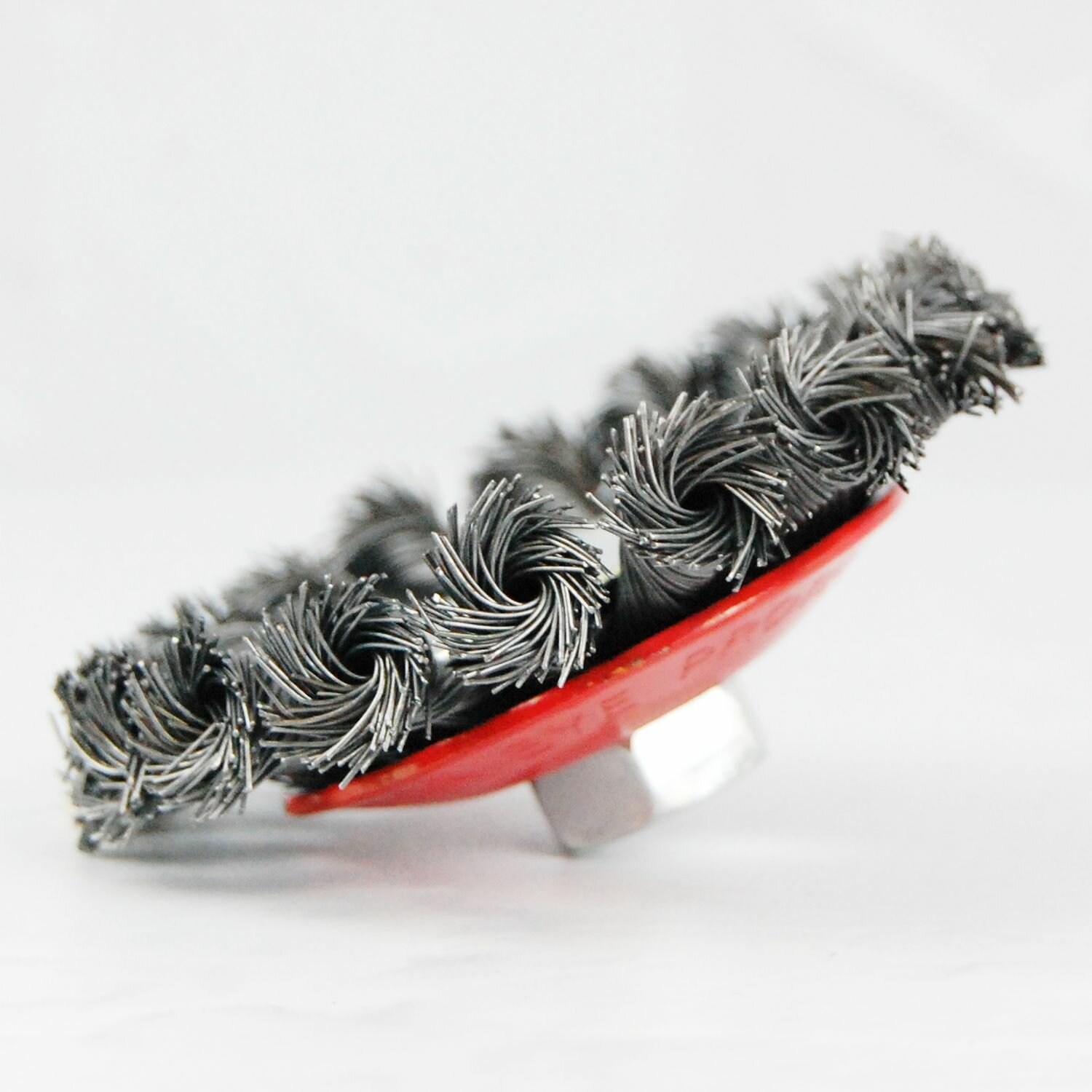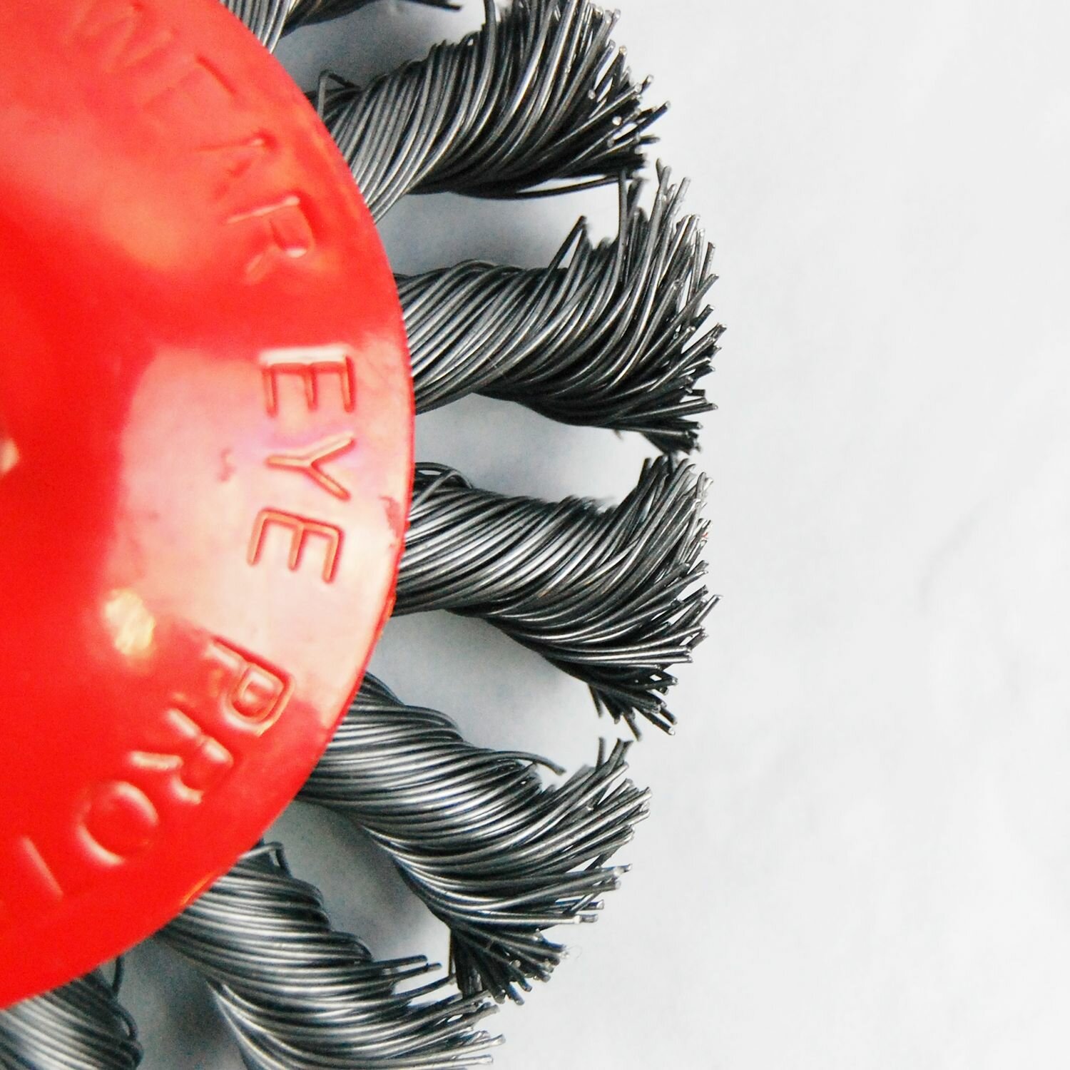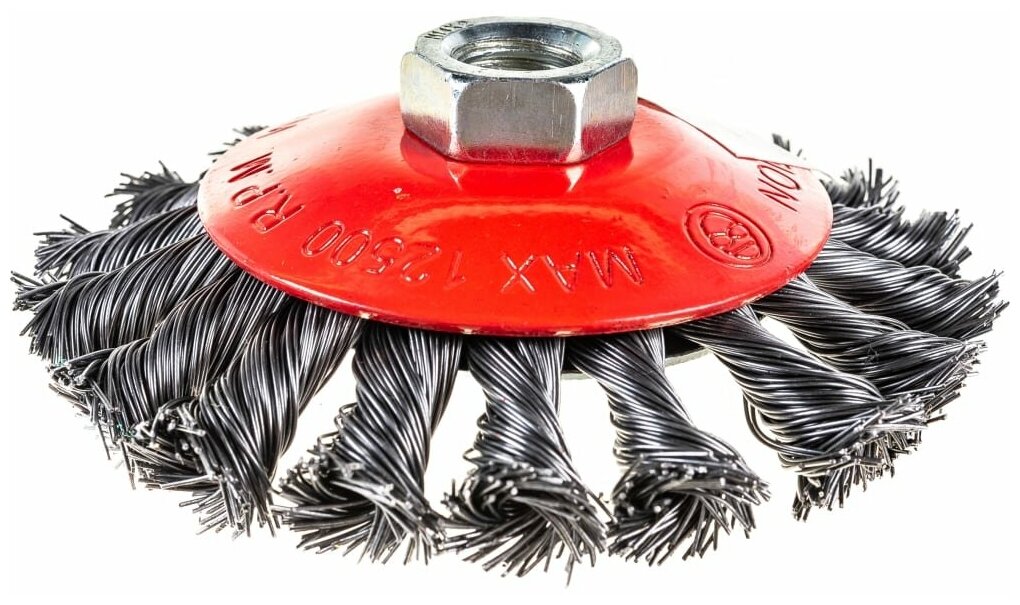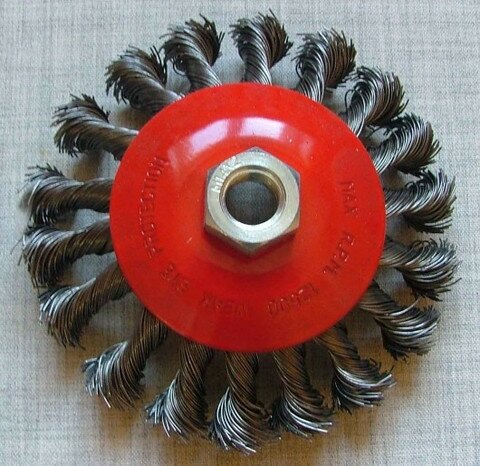 Корщетка-колесо с наклоном (коническая) Skrab (Скраб) идеально подходит для обработки; труднодоступных мест. Проигрывая по производительности обрабатываемой площади ( по сравнению с чашеобразными корщетками) Вы выирываете в интенсивности обработки. Витые конические корщетки с наклоном используются для грубой обработки (зачистки) металла, бетона, дерева при помощи болгарки (УШМ) за счет большего диаметра и большей жесткости скрученной проволоки чем у латунированных щеток.