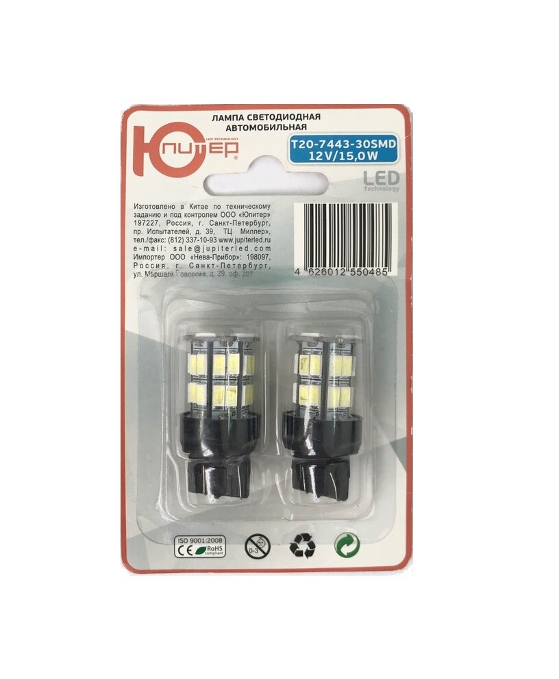Лампа светодиодная автомобильная с цоколем T20-7443 на 30 светодиодов. Характеристики:напряжение 12V, мощность 15W, 2-х контактная, белый свет. Предназначена для установки в габаритные и стоп огни.