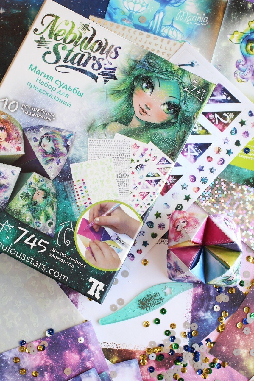 Отправляйся в увлекательное путешествие по бесконечной галактике вместе с девочками-звездочками Nebulous Stars! Галактика Nebulous Stars - это сказочный мир творчества и волшебства! Девочки готовы приоткрыть завесу тайны и раскрыть секреты космической силы и магии, проводить тебя в мир добра, красоты и положительных эмоций! Набор для предсказаний позволит собрать волшебное оригами! Декорируй его украшениями и буквами, а затем попытайся предсказать судьбу друга! В наборе: 10 бумажных заготовок, гелевая ручка, более 625 переводок, более 95 наклеек, более 55 страз, пластмассовый инструмент, инструкция, история звезды Маринии.