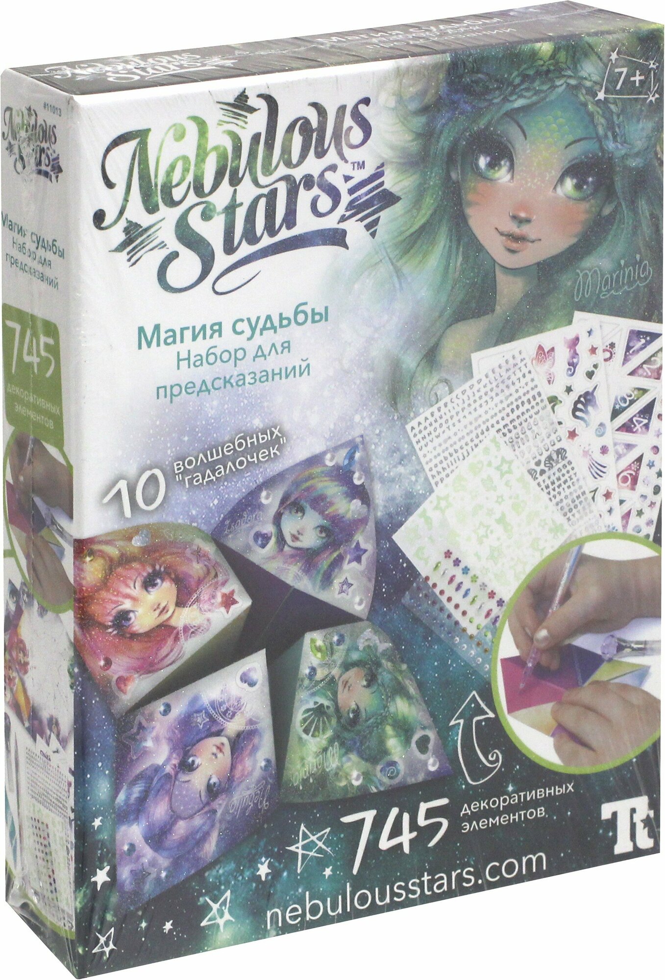 | Состав набора | 10 бумажных заготовок, гелевая ручка, более 625 переводок, более 95 наклеек, более 55 страз, пластмассовый инструмент, инструкция, история звезды Маринии |