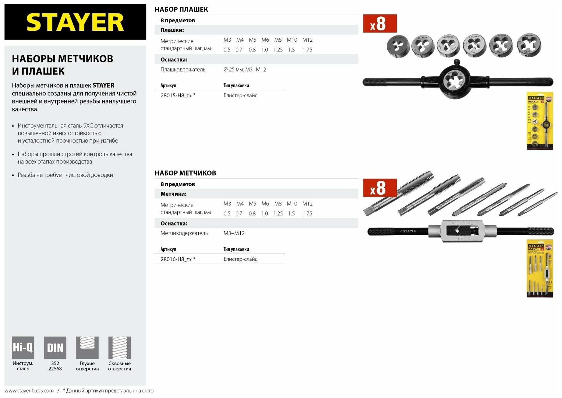 | Комплектация | 8 предметовМетчики(Метрические стандартный шаг, мм М3x0.5; М4х0.7; М5х0.8; М6х1.0;М8х1.25; М10х1.5; М12х1.75)Оснастка Метчикодержатель М3–М12 |