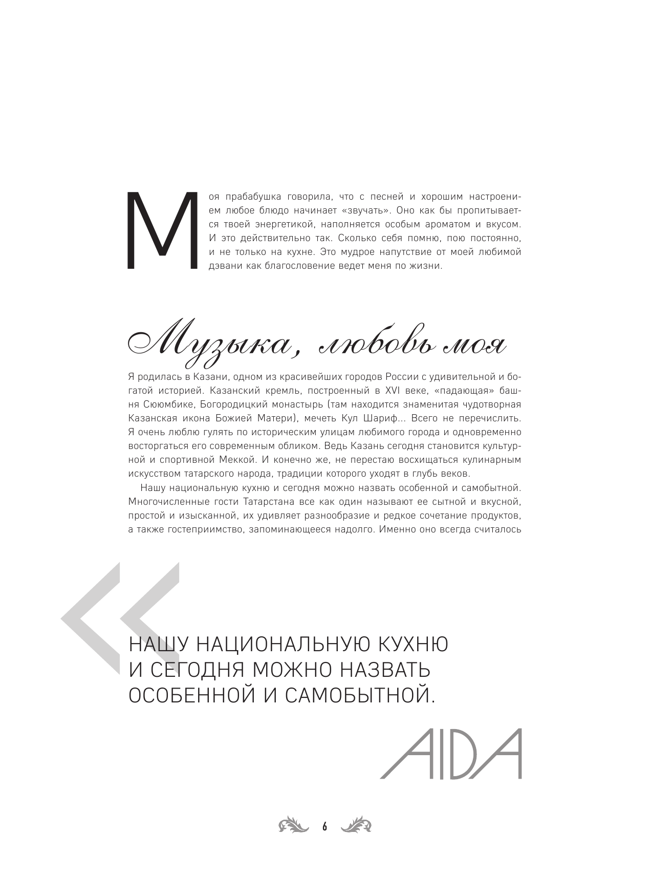 Второе увлечение Аиды - кулинария. Ее вдохновляют импровизации на кухне с чудесными семейными рецептами татарских блюд и любимыми рецептами, собранными на гастролях в разных странах и континентах. В книге "Еда как песня" Аида выступает в роли очаровательной гостеприимной хозяйки - присоединяйтесь к ее доброму и красивому домашнему застолью и попробуйте эчпочмак и губадию, чак-чак и сметанник, пельмени и оладьи, и множество других блюд, приготовленных по золотым канонам татарской кулинарии.