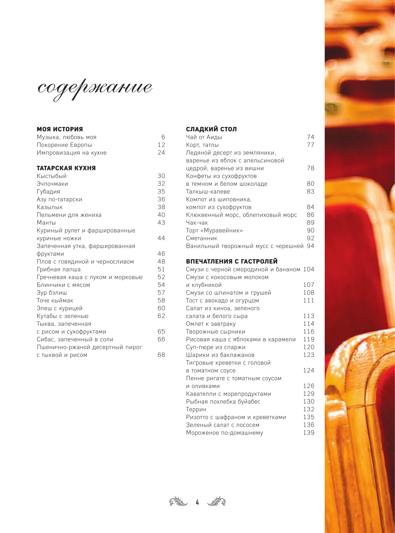 В книге вы найдете много обычных блюд простых и быстрых в исполнении, например блинчики с мясом, гречневая каша, но при этом с некой изюминкой. Так же много рецептов национальных татарских блюд. В целом книга хорошая, НО больше похожа на PR автора – оперной певицы Аиды Гарифуллиной. Примерно треть книги посвящена ее биографии и истории жизни. Много ее портретов и фото из семейного альбома. В целом книга достойная внимания.