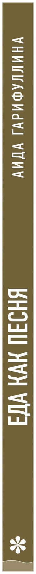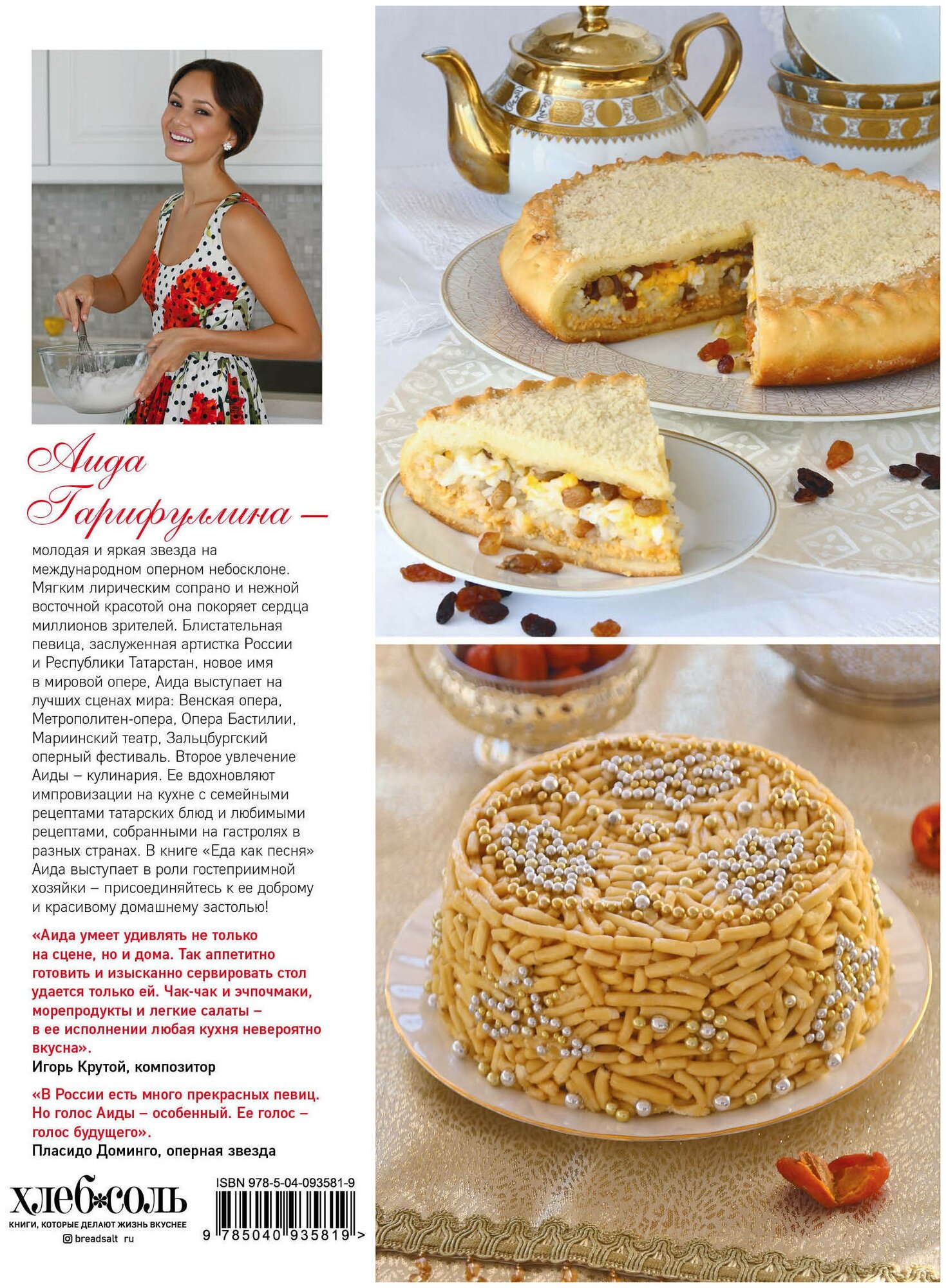 Автор - звезда оперной сцены Аида Гарифуллина. Её вдохновляют импровизации на кухне с чудесными семейными рецептами татарских блюд и любимыми рецептами, собранными на гастролях в разных странах и континентах. В книге «Еда как песня» Аида выступает в роли очаровательной гостеприимной хозяйки – присоединяйтесь к её щедрому домашнему застолью и попробуйте эчпочмак и губадию, чак-чак и сметанник, пельмени и оладьи, и множество других блюд, приготовленных по золотым канонам татарской кулинарии.