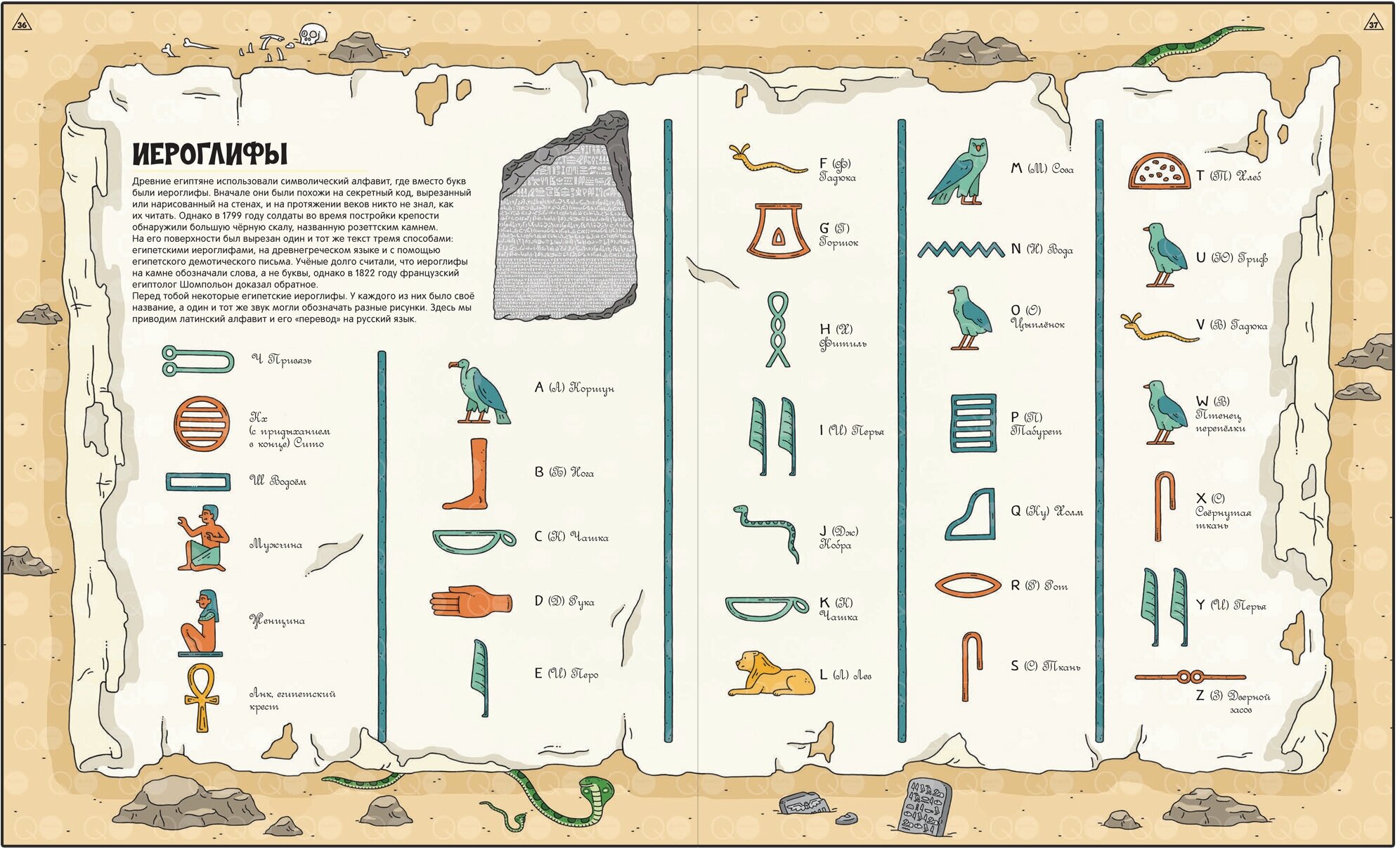 Ты встретишься с самыми знаменитыми фараонами — реформатором Эхнатоном, царём-мальчиком Тутанхамоном, Хеопсом и прекрасной Клеопатрой. Ты прикоснёшься к тайне Сфинкса, узнаешь, как строили пирамиды с хитроумными ловушками, как делали мумии и как жили простые египтяне. В конце ты найдёшь изображения настоящих иероглифов, временную ось и словарь терминов.