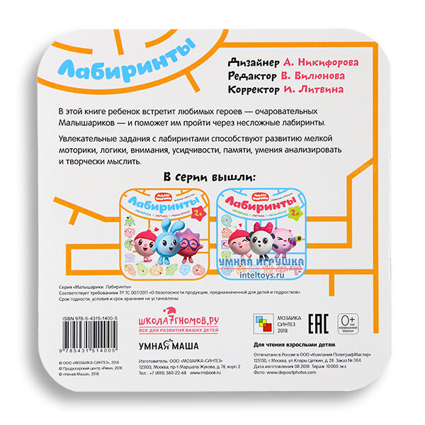 Книга «Веселые прогулки» серии «Малышарики. Лабиринты» поможет весело провести время дома, в дороге или на отдыхе. В книге ребенок встретит героев любимого мультсериала и поможет им пройти через 12 несложных лабиринтов. Вооружившись карандашом или фломастером, малыш поможет очаровательным Малышарикам добраться до фруктов, ягод и т. д.