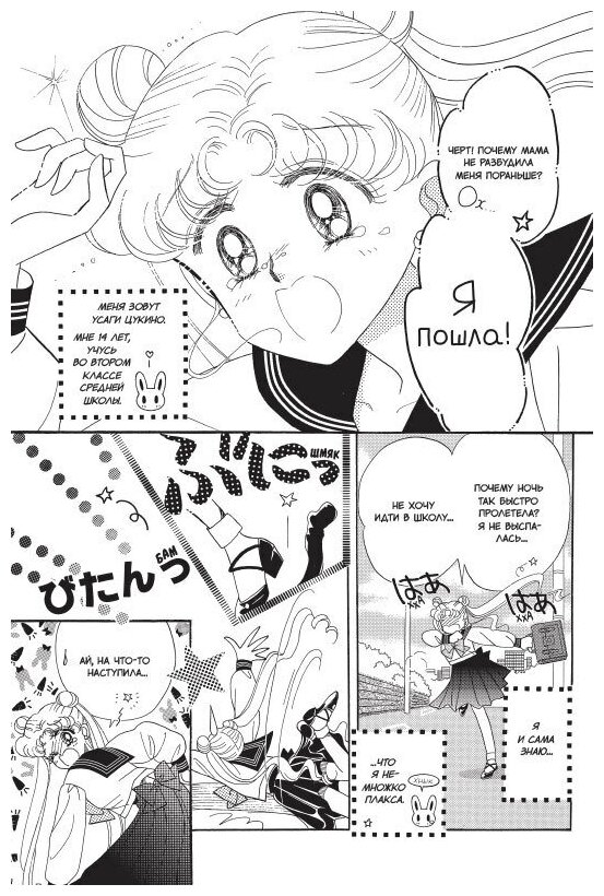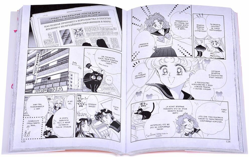 Издание очень порадовало качеством: белые страницы, не тонкие, довольно плотные, не просвечивают. Для сравнения: у англоязычной версии бумага тоньше и темная, похожая на газетную. Печать четкая (на мой вгляд все четко и с контрастью все нормально, но я не эксперт). Суперобложка полностью снимается. А еще она приятная на ощупь, поэтому книгу держать в руках - удовольствие. Цветные страницы только в самом начале (3 листика), не считая обложки и суперобложки. Имена переведены с суффиксом -ТЯН, соответственно и сами имена у нас: Такэути, Мамору ТИБА и т.д. Далее насчет имен. Используются: Жадеит, Нефрит, Берилл. Атаки у нас переведены знакомыми фразами вроде: "Лунная призма, дай мне силу", "Лунная диадема, в бой!" и т.п. Все мелкие надписи, звуки - все это переведено.