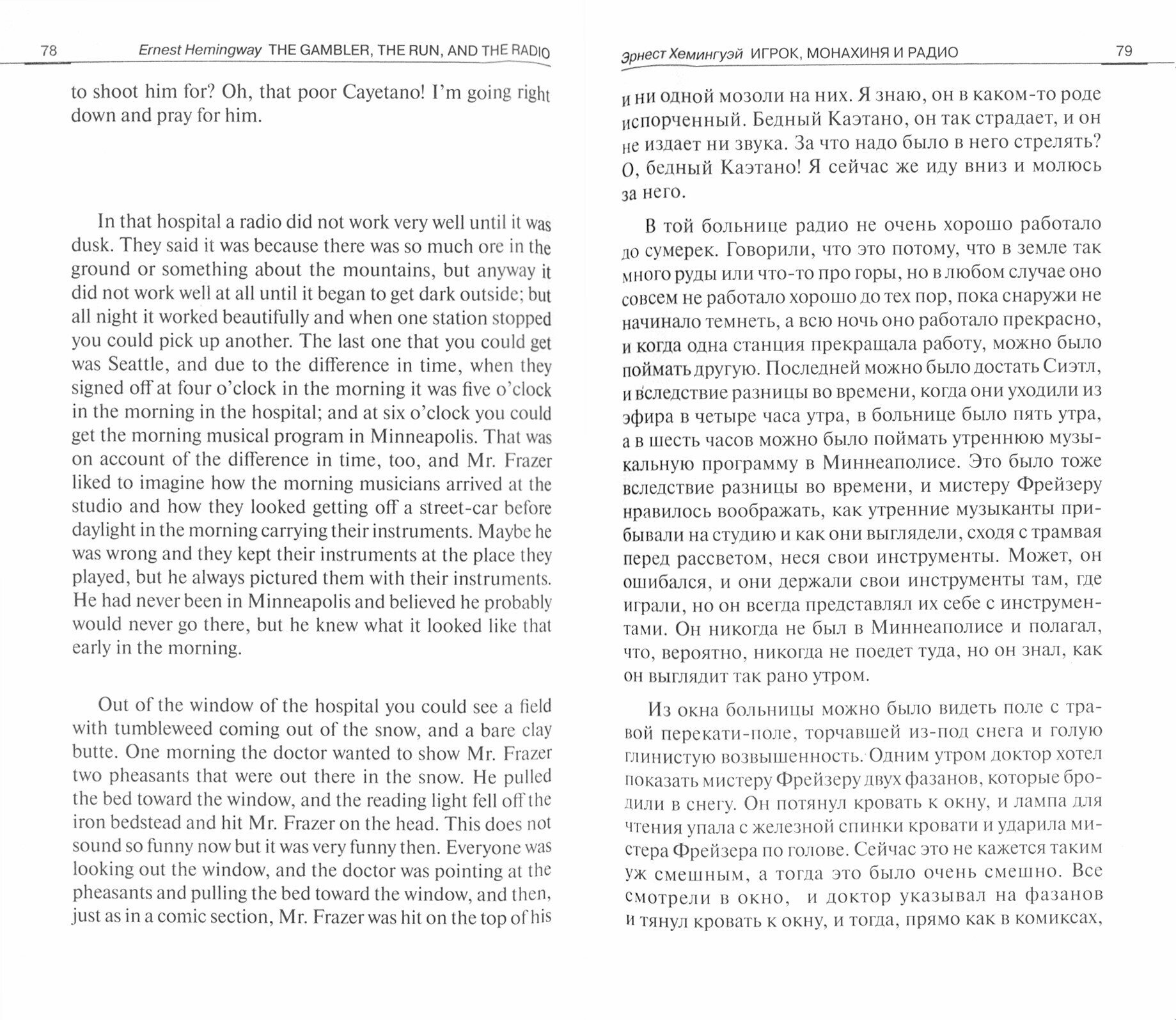 Книга в мягком переплете. Сразу хочу отметить, что переплет неудобный. Он жесткий и поэтому при чтении книга постоянно хочет закрыться. Бумага страниц также жесткая. Шрифт средний. Проблем при его чтении не возникало. В книги несколько рассказов. Все они небольшие по 50-60 страниц, но интересные. Обычно Хэмингуэй известен произведением "Старик и море", а в этой книге можно открыть для себя новые рассказы этого автора. Перевод на русский язык выполнен качественно, ошибок не было найдено.