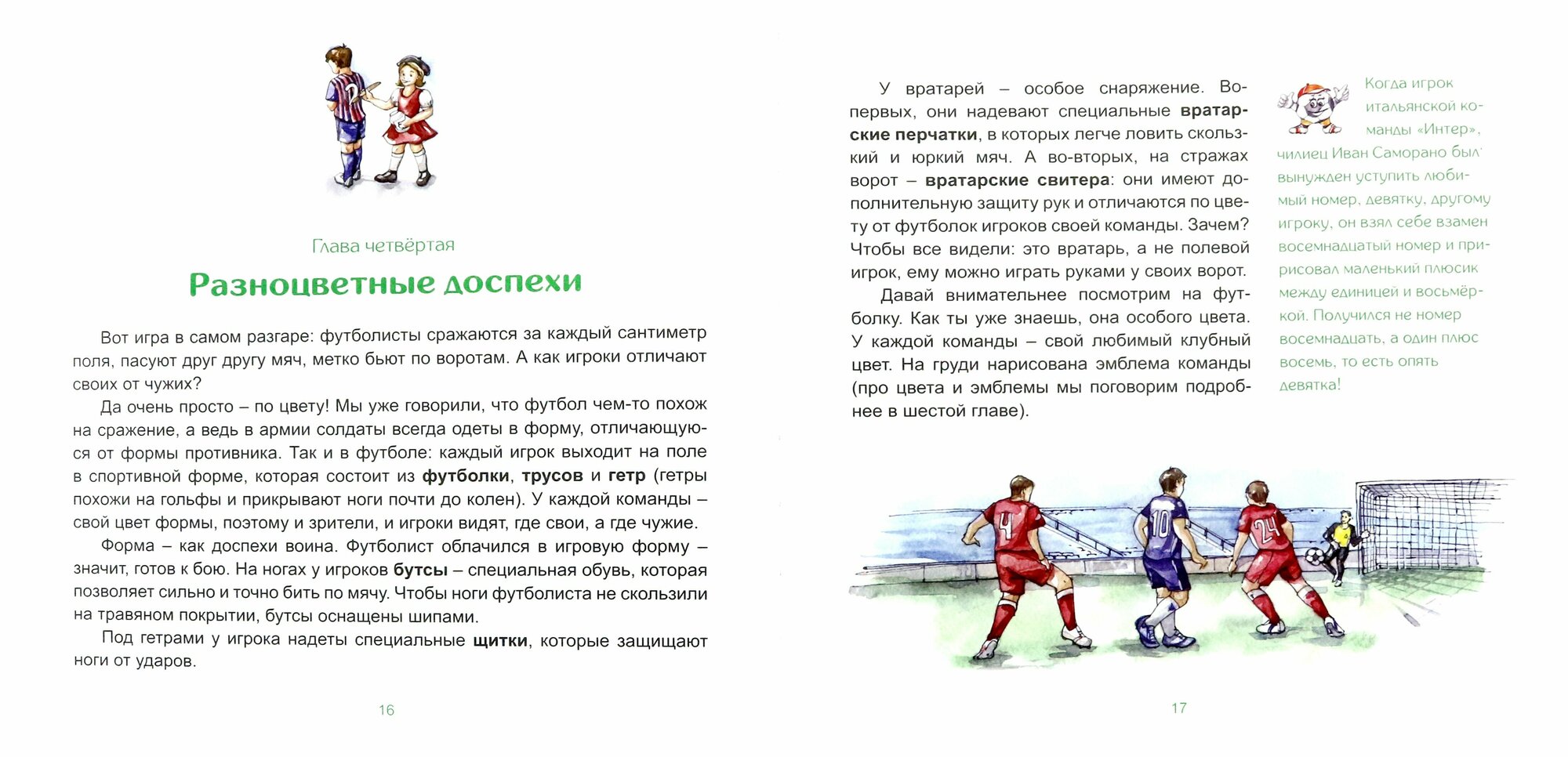 Неужели в футбол когда-то запрещалось играть под страхом смертной казни?! А какие наказания существуют в современном футболе, как распределяются номера среди игроков команды, кто такой «двенадцатый игрок» (ведь всего в команде 11 человек), сколько насчитывается разновидностей этой эмоциональной игры? Оказывается, читать про футбол не менее интересно, чем играть! Художник Екатерина Зайцева ярко и эмоционально донесла до маленького читателя характер футбольных баталий, историю игры и костюма. А ещё её творение Мячонок-футболёнок (как его окрестили наши читатели) сопровождает интересные авторские отступления, которые выделены зелёным цветом. Например, история о похищении кубка победителя, о команде-победителе с результатом 149:0, о том, чем можно заменить любимый номер на форме, если вынужден уступить его другому игроку…