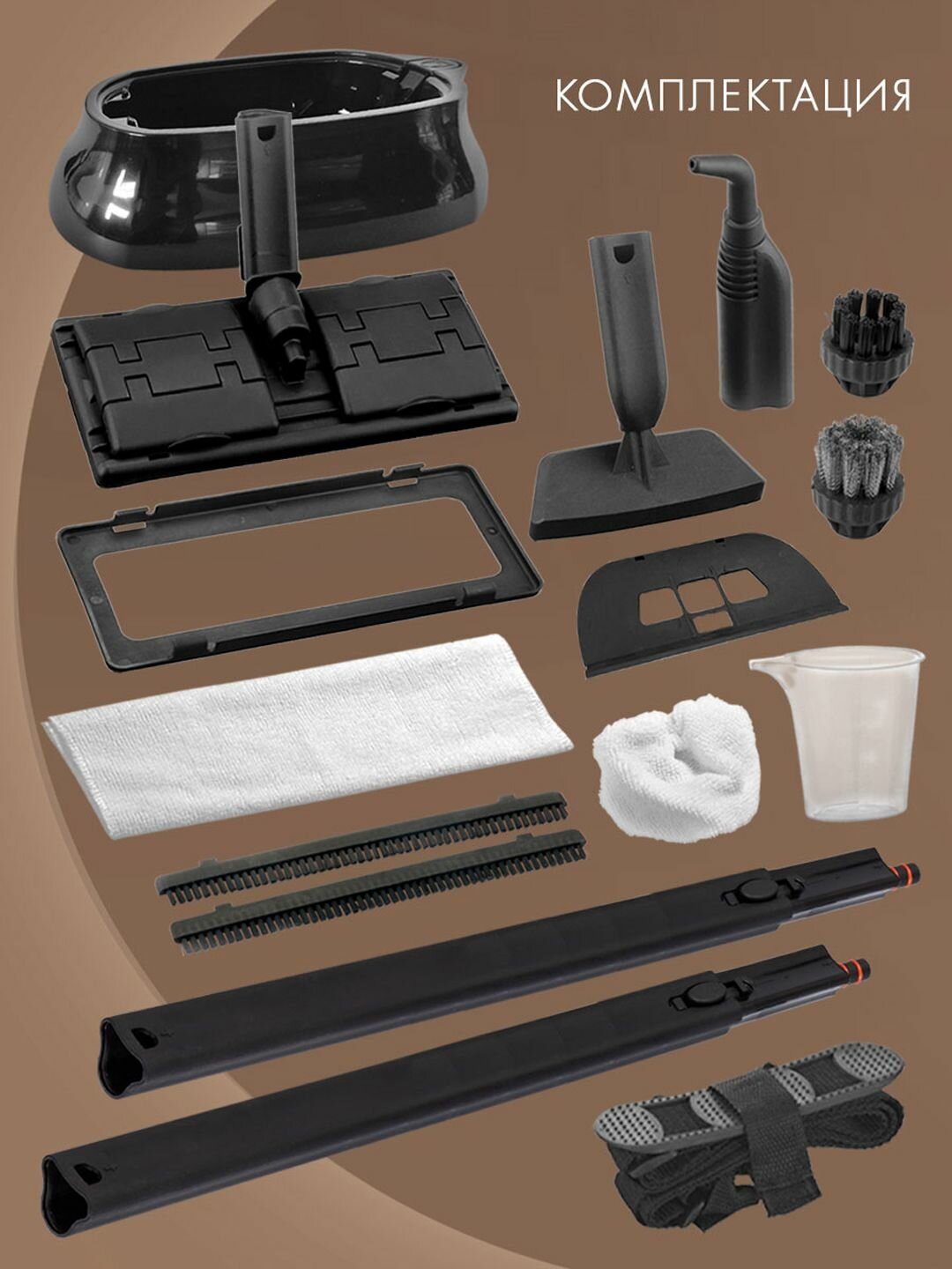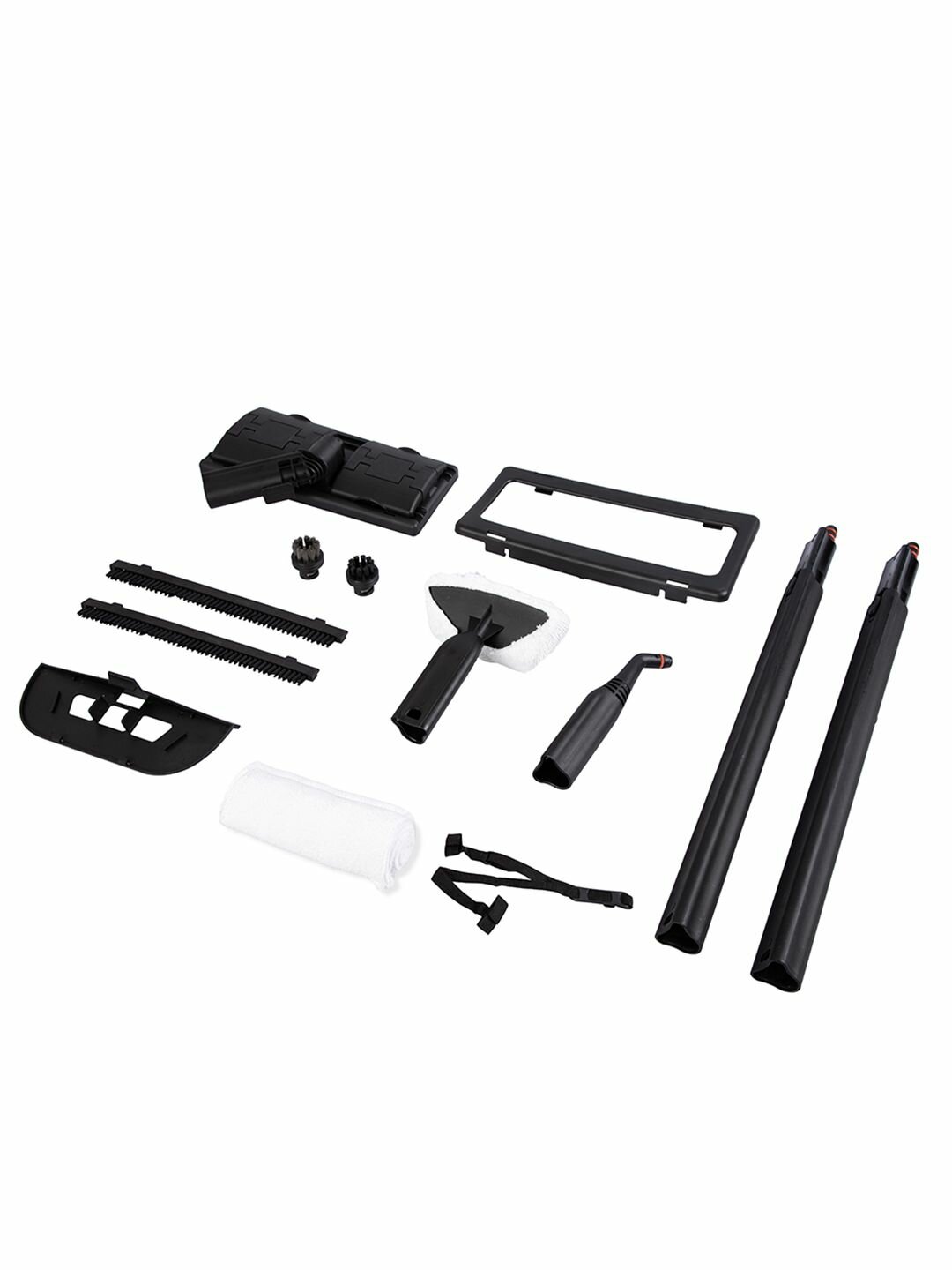 | Комплект поставки | Пароочиститель, тканевый чехол для насадок х 2 шт, насадка-держатель для ковра, насадка-скребок для мытья стекол и зеркал, насадка для отпаривания одежды, насадка-щетка для очистки поверхностей (пола, ковров), насадка-щетка с полимерной щетиной, насадка-распылитель с изогнутым концом, круглая насадка-щетка с жесткой щетиной, круглая насадка-щетка с мягкой щетиной, удлинительные трубки x 2 шт., наплечный ремень, мерный стакан, документация |