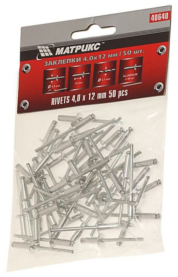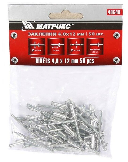 Заклепки, 4,0 х 12 мм, 50 шт,// MATRIX отлично подходят для соединения двух материалов при помощи электрозаклепочника. Соединяет очень прочно и качественно. Благодаря оптимальному количеству, хватит на все нужды.