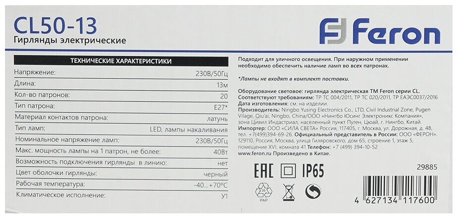 Гирлянда светодиодная 29885 IP65 - продукт известной компании Feron (Китай). Имеет максимальную мощность 100 Вт.