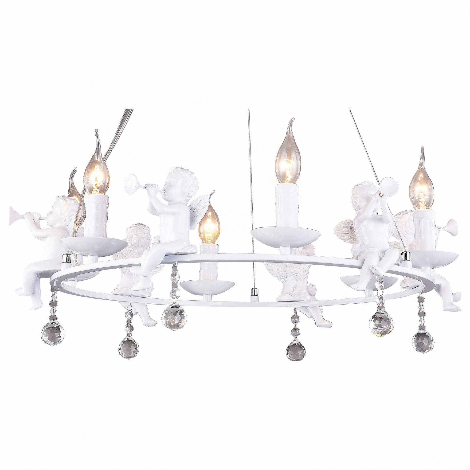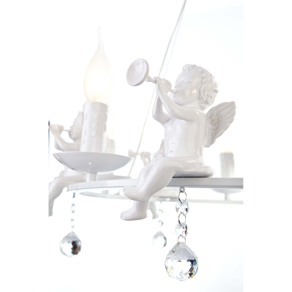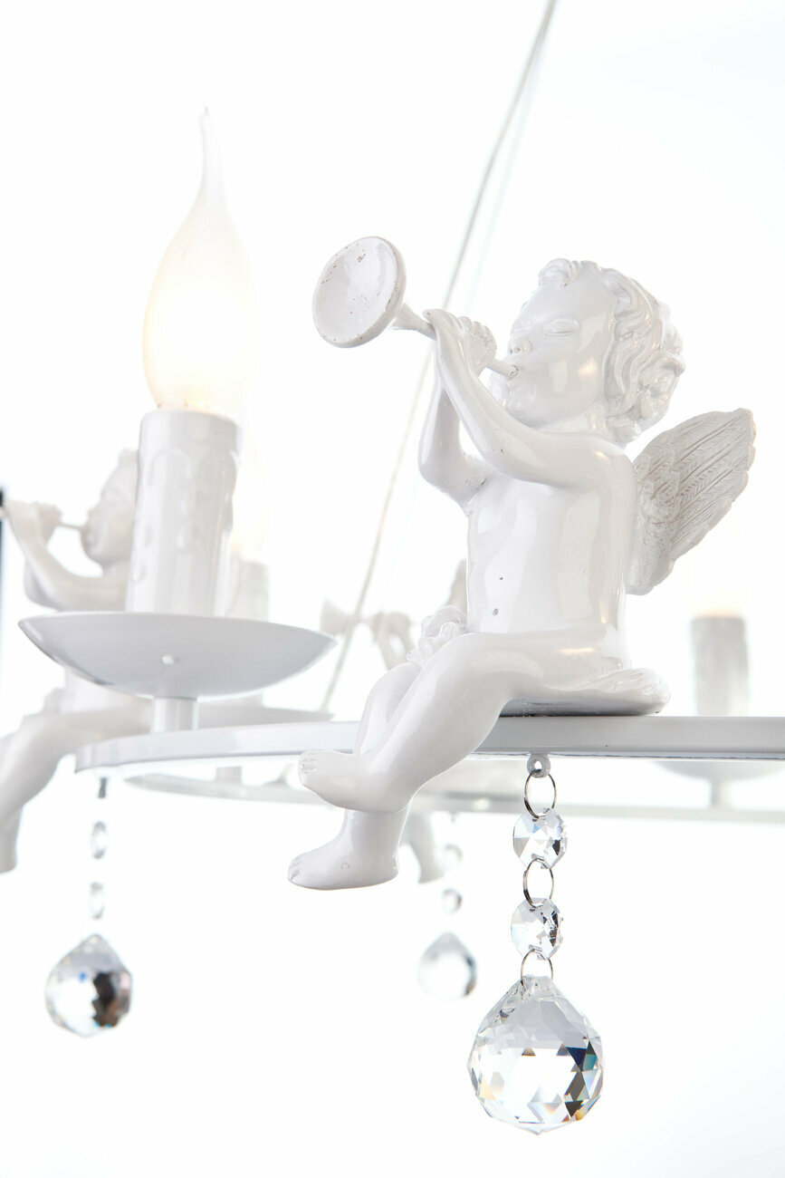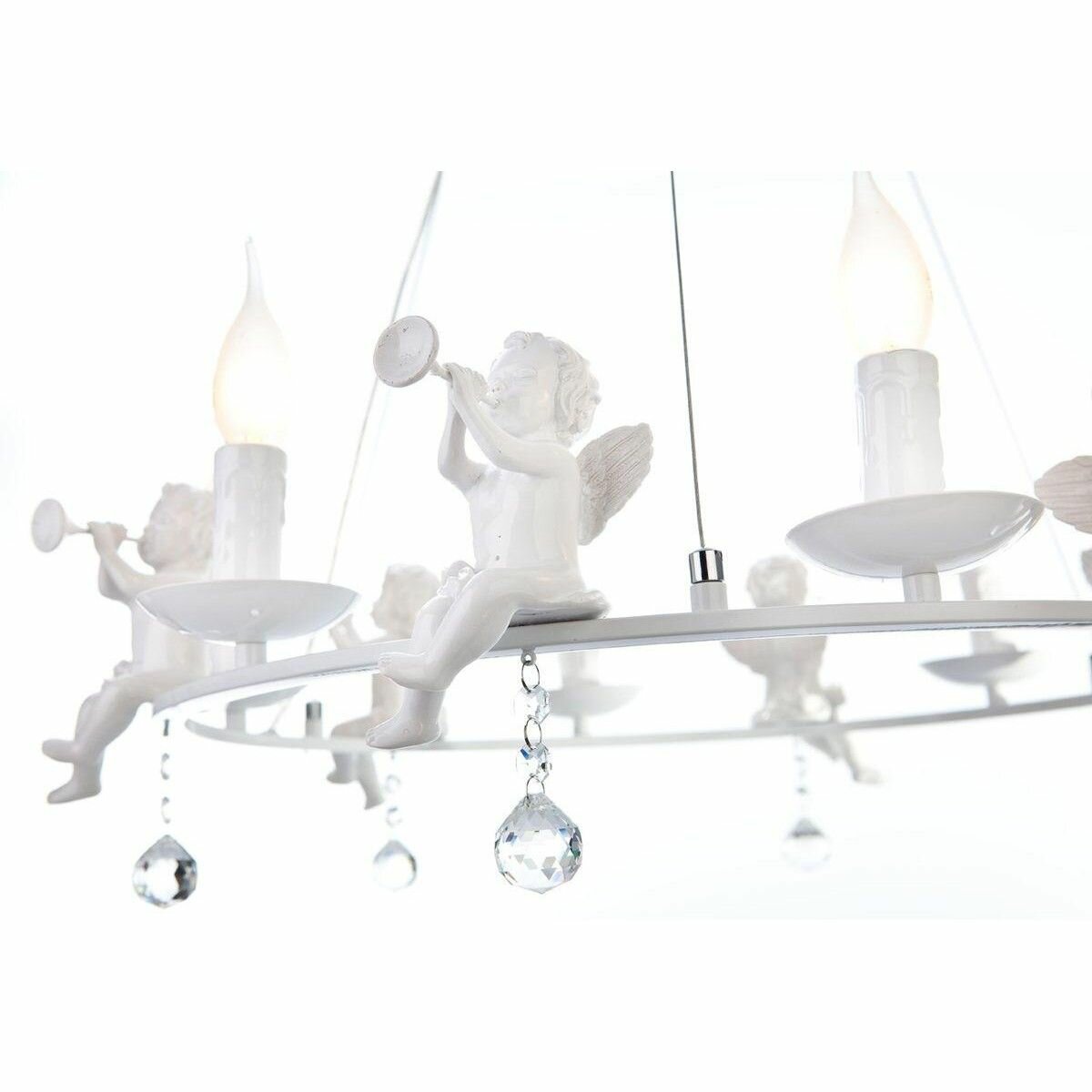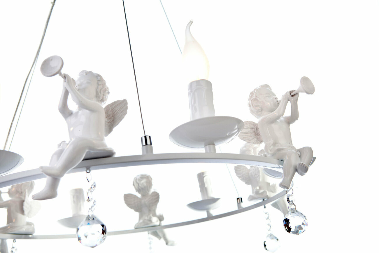Оригинальная модель люстры из известной линейки Escada украсит помещение, оформленное в классическом стиле, а также комнату в стиле модерн. Белый цвет эффектно подчеркивает красивые фигурки в виде ангелов. Конструкцию выигрышно дополняют элегантные подвески из хрусталя, расположенные по всему периметру светильника. Люстра представляет собой конструкцию, состоящую из металлического обруча, который удерживает несколько проводов. На обруче расположены патроны для ламп в виде свечей и декоративные фигурки. Материалы изготовления отличаются хорошей износостойкостью. Люстра не требует специального ухода.