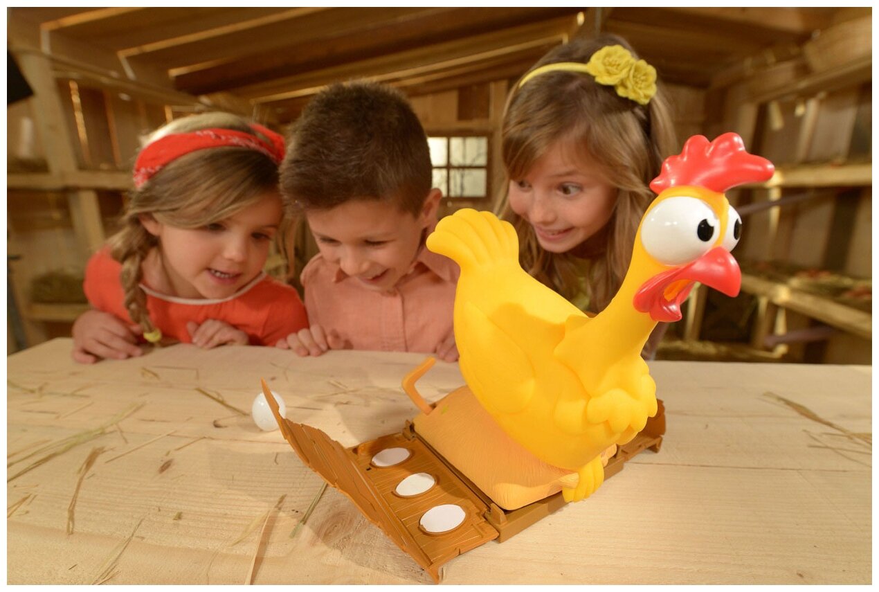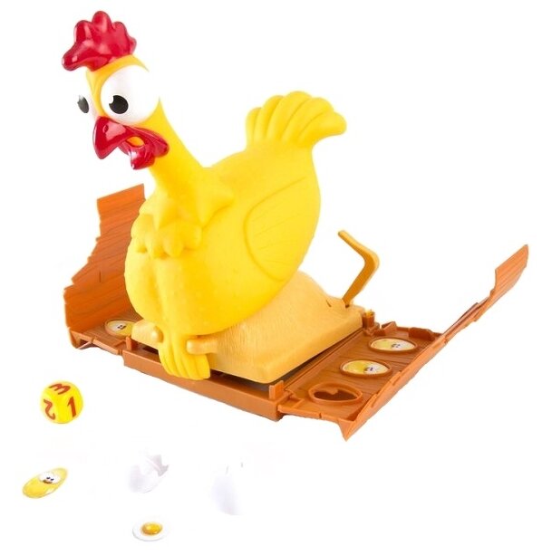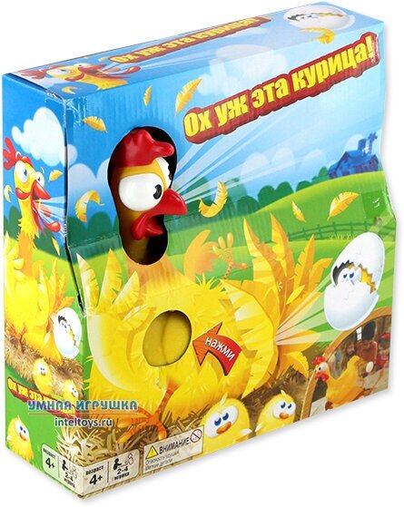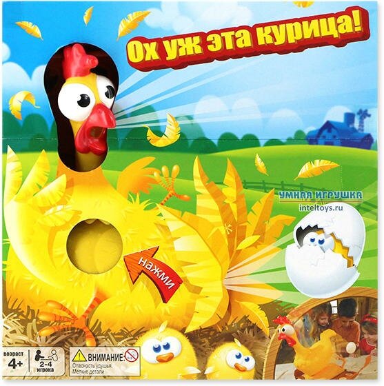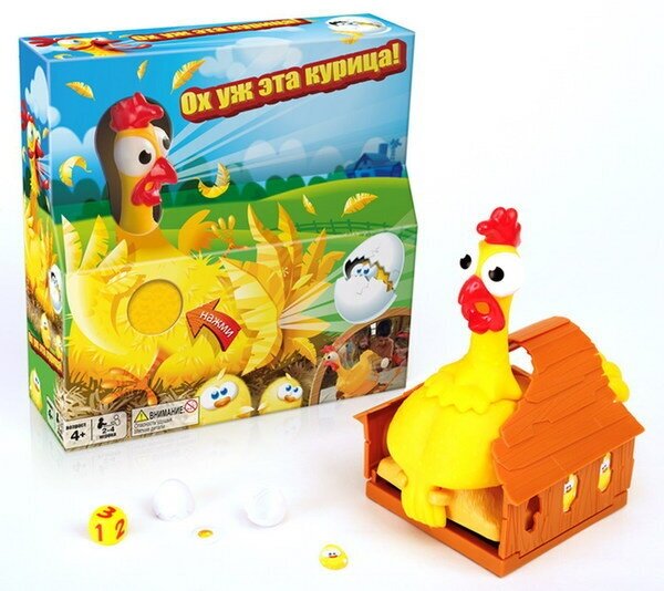 Представляем вашему вниманию увлекательную настольную игру для детей дошкольного возраста от Ooba – «Ох, уж эта курица». Правила игры просты. Игроки по очереди бросают кубик и нажимают на курицу столько раз, сколько выпало очков. В один момент домик курицы раскрывается, и она сносит яйцо. Его нужно «разбить», и из яйца выпадет монетка со сторонами яичница-цыпленок. Если выпал цыпленок, нужно вынуть одного из домика, забрать и присвоить себе 1 очко, вложить монетку обратно в яйцо и играть дальше, пока не будут разыграны все 6 цыплят.