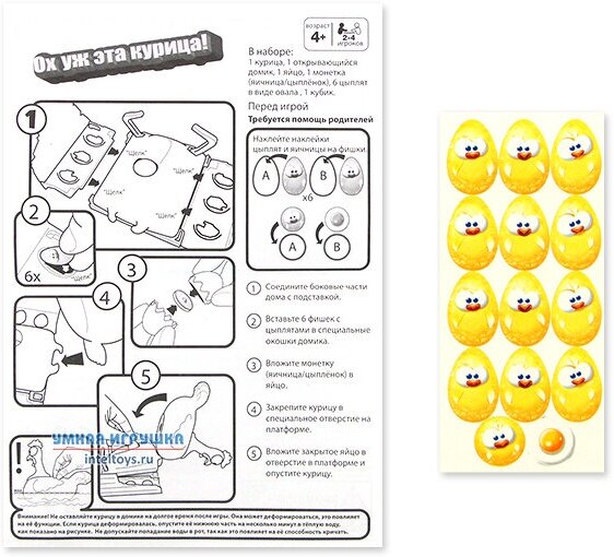 | Комплектация | курица; домик; яйцо; монетка; 6 цыплят; кубик |