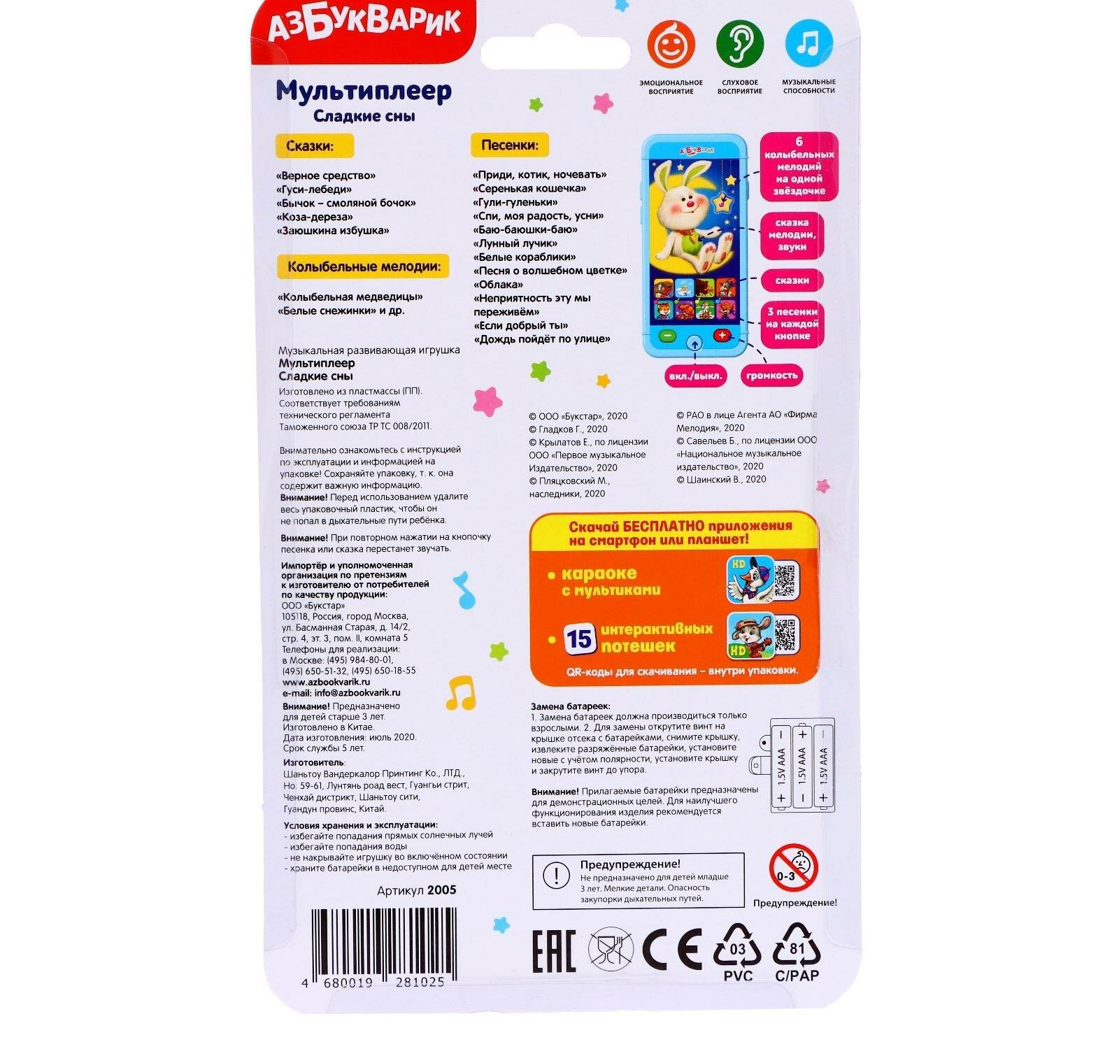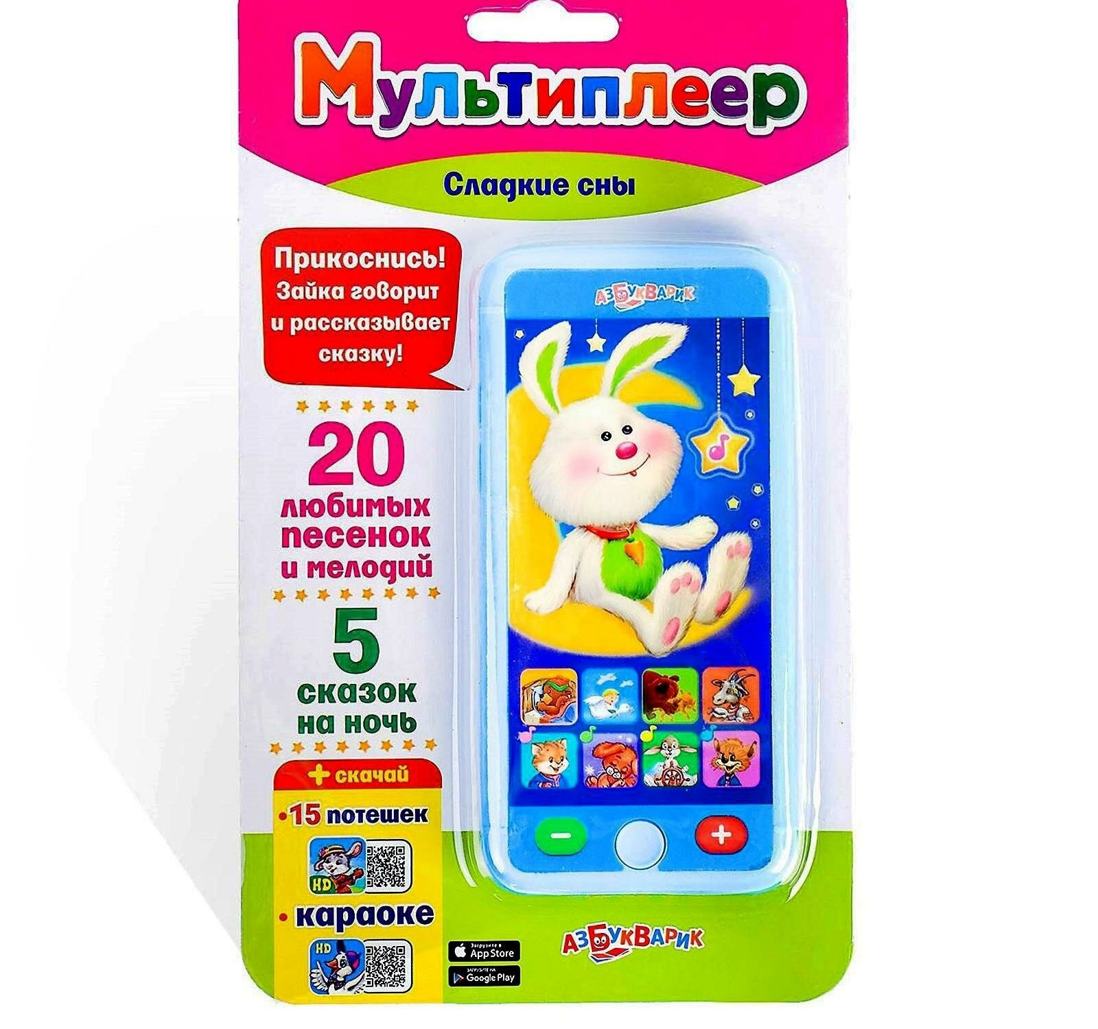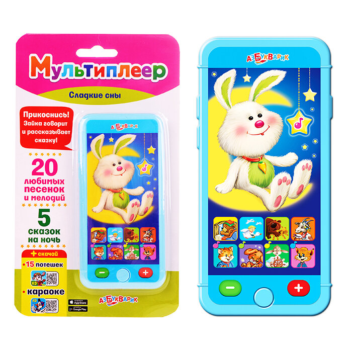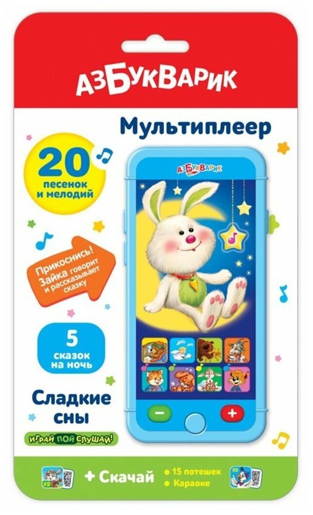 В этом красочном мультиплеере малышей ждёт 20 любимых песенок ("Гули-гуленьки", "Белые кораблики", "Если добрый ты", "Спи, моя радость, усни", "Баю-баюшки-баю" и другие) и 5 сказок на ночь ("Верное средство", "Гуси-лебеди", "Бычок - смоляной бочок", "Коза-дереза", "Заюшкина избушка"). Особенным плюсом для родителей будет наличие кнопочек для регулировки громкости песен.А по QR-коду внутри упаковки можно скачать интерактивную книжку "Караоке" и 15 потешек для смартфона или планшета в приложении "Азбукварик".