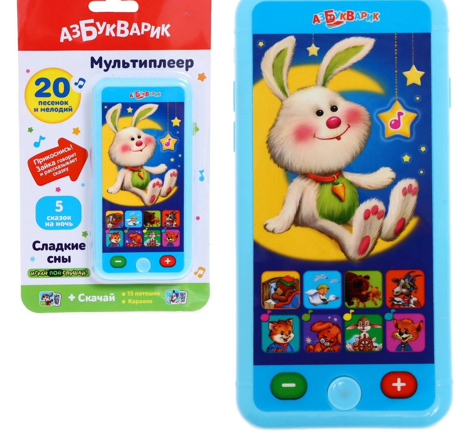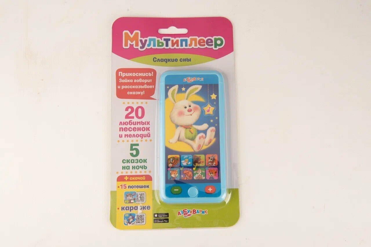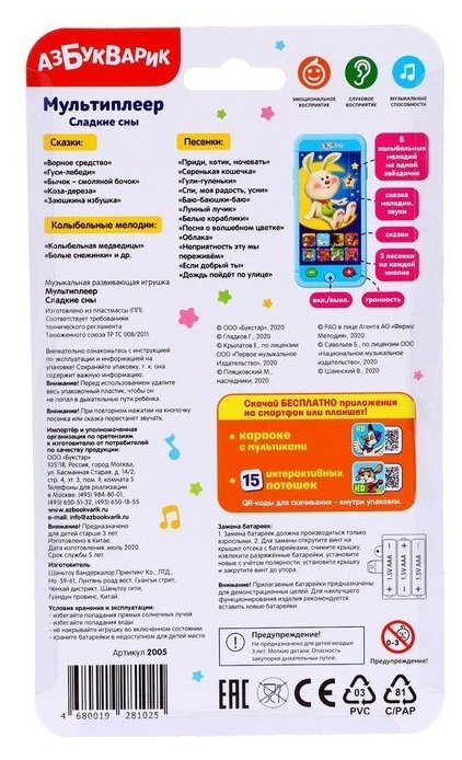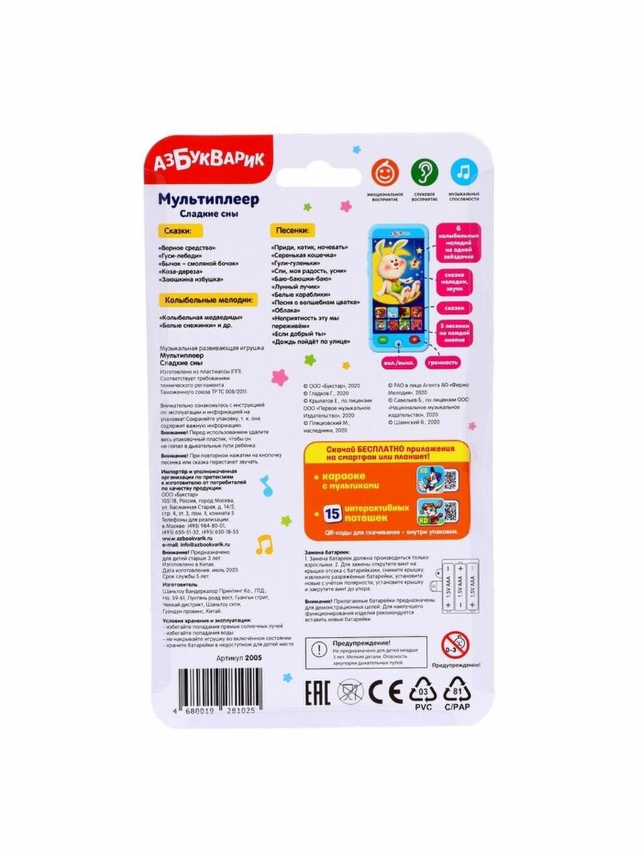 В этом красочном мультиплеере малышей ждёт 20 любимых песенок ("Гули-гуленьки", "Белые кораблики", "Если добрый ты", "Спи, моя радость, усни", "Баю-баюшки-баю" и другие) и 5 сказок на ночь ("Верное средство", "Гуси-лебеди", "Бычок - смоляной бочок", "Коза-дереза", "Заюшкина избушка"). Особенным плюсом для родителей будет наличие кнопочек для регулировки громкости песен.А по QR-коду внутри упаковки можно скачать интерактивную книжку "Караоке" и 15 потешек для смартфона или планшета в приложении "Азбукварик".