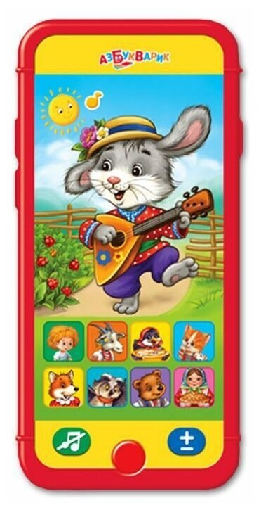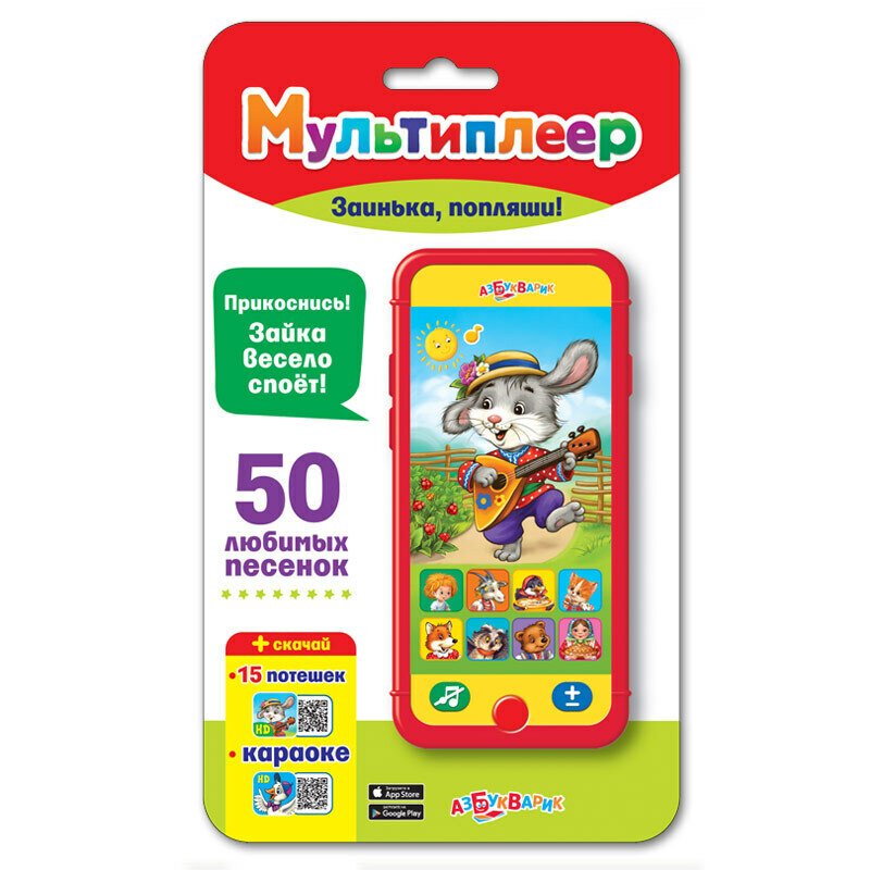 Детский мультиплеер торговой марки Азбукварик представит ребенку 50 замечательных песенок, знакомых не одному поколению. На корпусе детского телефона Заинька, попляши! расположен ряд кнопок, нажав на которые, ребенок активирует воспроизведение музыки.
