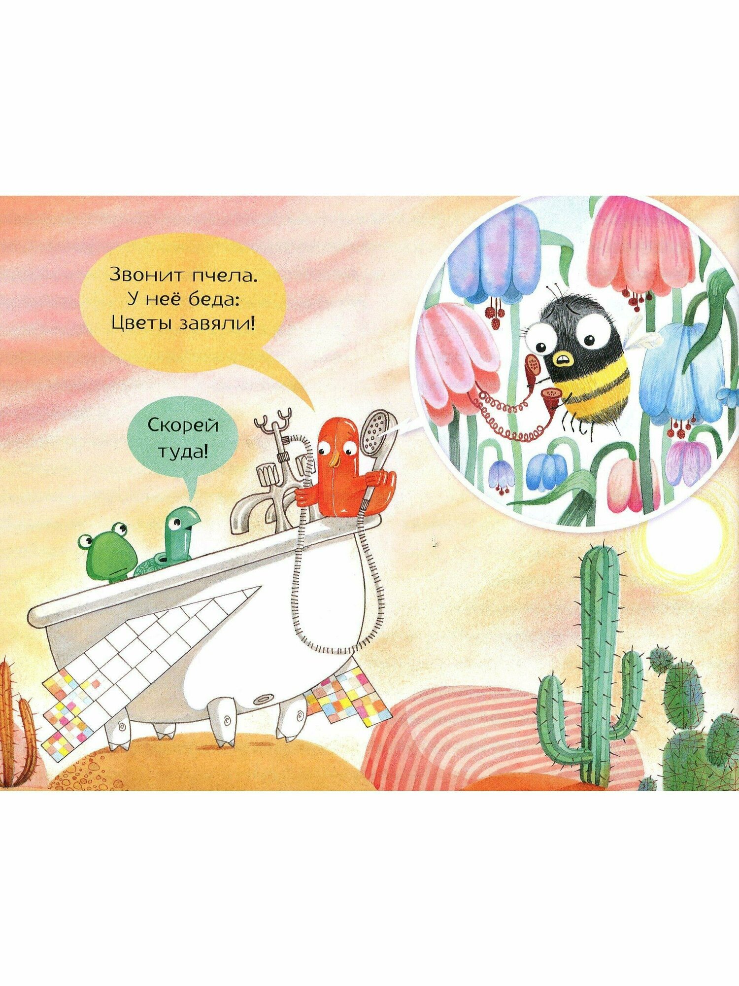 Возрастная категория 2-4 года, ближе к 2-3, конечно. В книге очень не много текста, сюжет тоже очень прост: пока дома никого нет игрушки из ванной (уточка, лягушонок, заводная черепашка) оживают и принимают звонки, с просьбой о помощи. Наполняют ванную водой и спешат на помощь к тем, кому она нужна: кенгуру нужно напоить, свинку помыть, цветы для пчелки помыть и т.п.