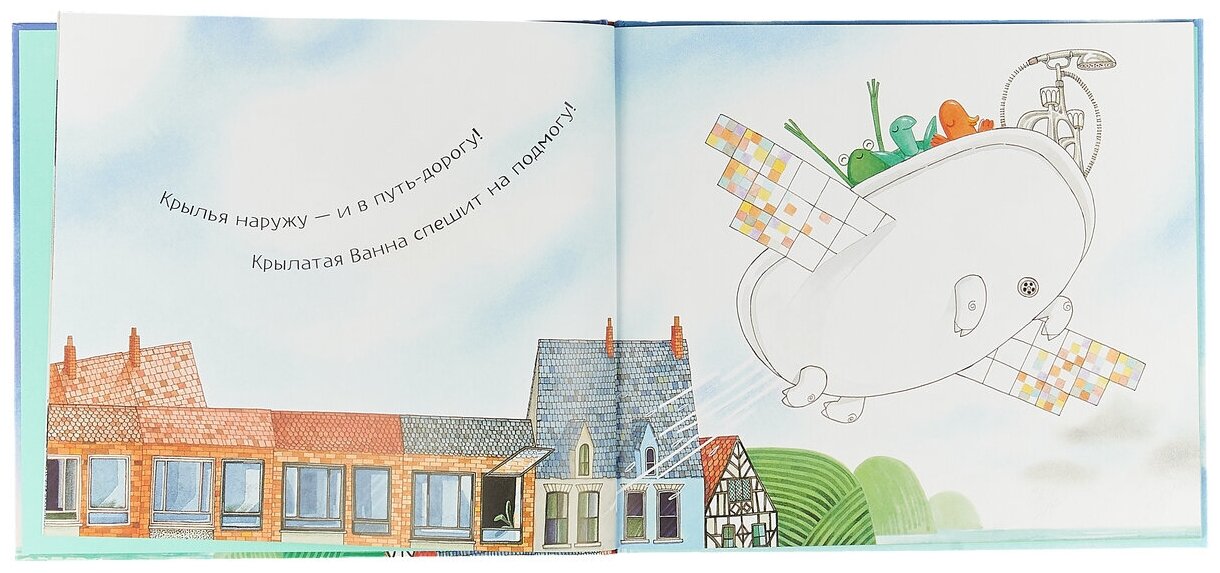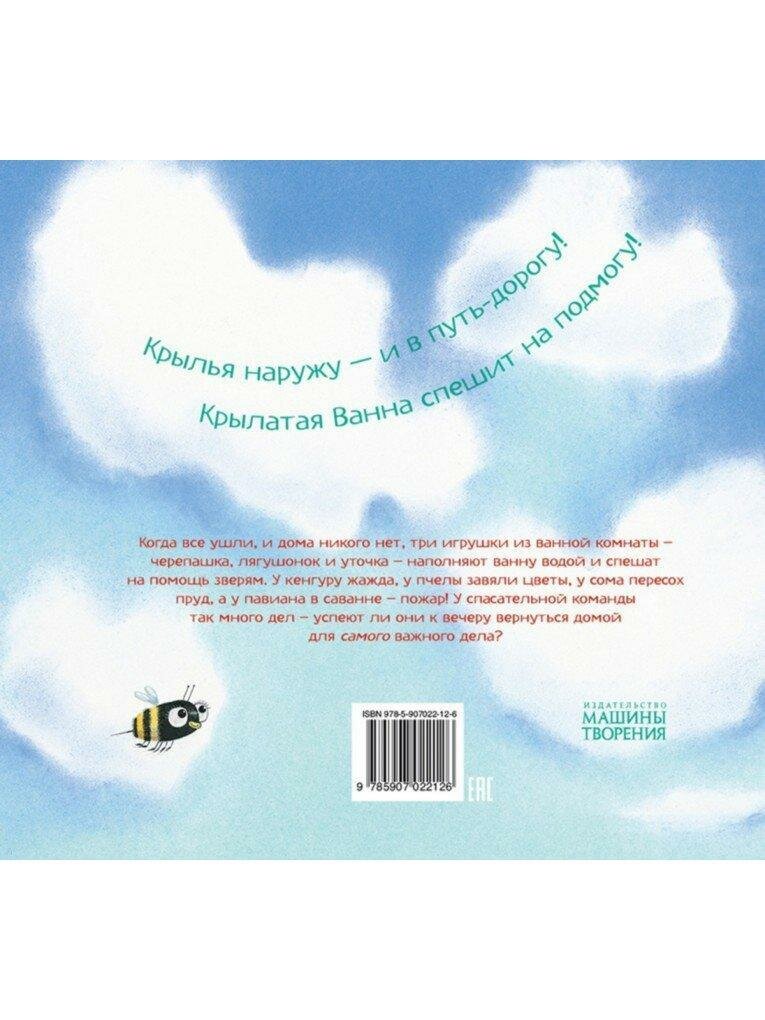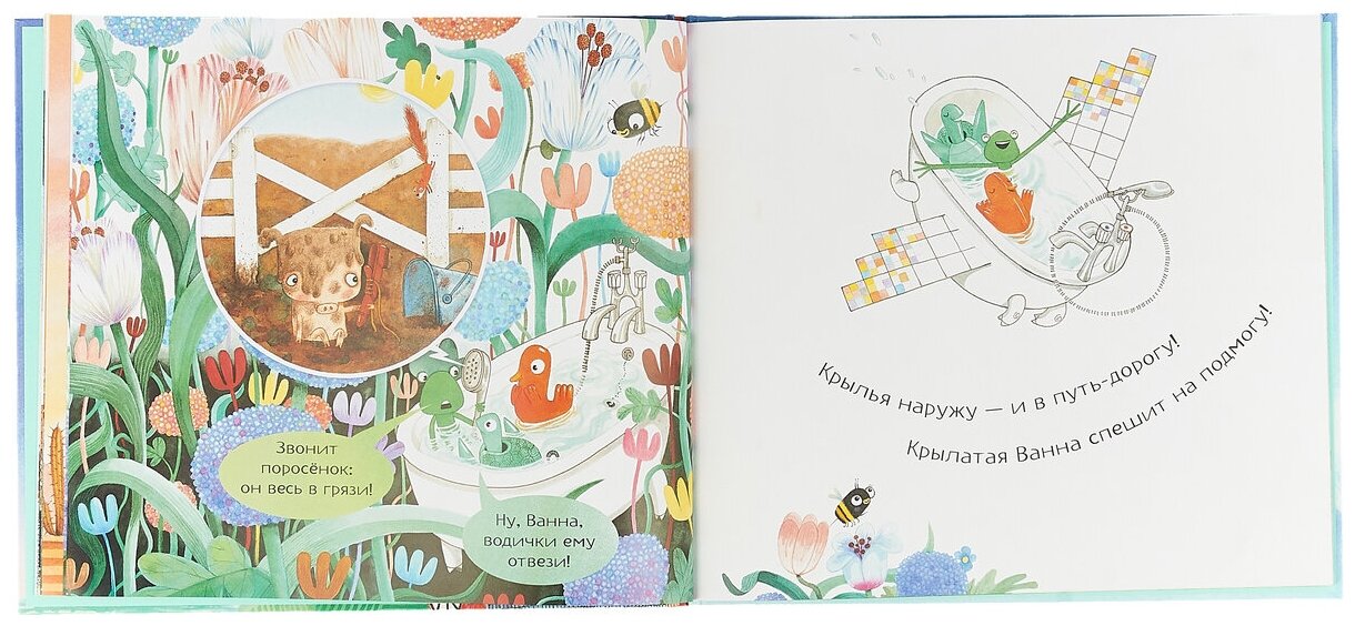 Каждую страницу повторяются одинаковые строчки стиха "Крылья наружу - и в путь-дорогу! / Крылатая Ванна спешит на подмогу!"