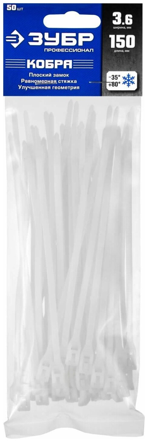 Кабельные стяжки Кобра отличаются от обычных стяжек замком с низким профилем. Плоский замок не оставляет выступов, благодаря чему крепление выглядит более эстетично, повышается безопасность крепления. Стяжки Кобра можно использовать в ресторанных двориках и других местах большого скопления людей; Повышенная морозоустойчивость и термостойкость; Высокая прочность и эластичность; Устойчивость к воздействию горючих и смазочных веществ и большинства химикатов; Диапазон рабочих температур от -35°С до +80°С допускает использование хомутов в самых разнообразных условиях