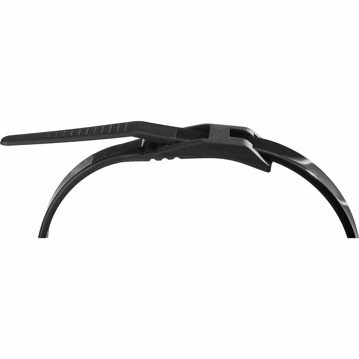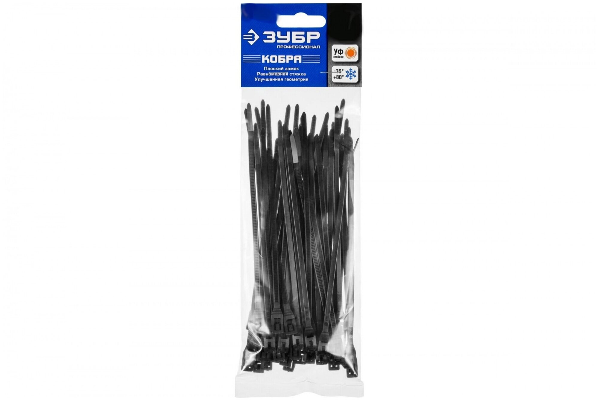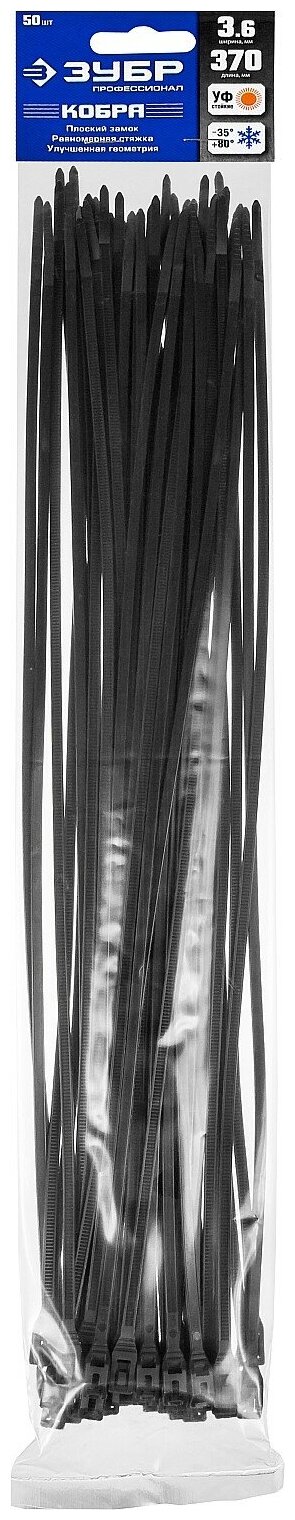 Кабельные стяжки с плоским замком ЗУБР кобра Профессионал нейлоновые (РА66) черные 3.6 х 370 мм 50 шт. (30935-36-370)Модель - 30935-36-370Технические характеристики:-Ширина: 3.6 мм-Длина: 370 мм-Усилие на разрыв: 18.14 кгс-Упаковка: 50 шт.Электромонтажный крепеж предназначен для стяжки кабелей и проводов в пучки, а также крепления электропроводки к различным поверхностям. Стяжки, клипсы, дюбель-хомуты и монтажные площадки легко, быстро и удобно монтировать как внутри, так и вне помещений. Кабельные стяжки имеют замковый механизм одностороннего хода, который может быть неразъемным или разъемным (для многоразового использования). Черные стяжки отличаются стойкостью к ультрафиолетовому излучению, поэтому рекомендуется использовать их вне помещений. Материалом стяжек является самозатухающий нейлон 6.6, не содержащий галогенов. Благодаря нейлону стяжки обладают рядом бесспорных преимуществ.Преимущества:Кабельные стяжки Кобра отличаются от обычных стяжек замком с низким профилем. Плоский замок не оставляет выступов, благодаря чему крепление выглядит более эстетично, повышается безопасность крепления. Стяжки Кобра можно использовать в ресторанных двориках и других местах большого скопления людей;Благодаря устойчивости к воздействию ультрафиолетового излучения хомуты можно использовать вне помещений;Повышенная морозоустойчивость и термостойкость;Высокая прочность и эластичность;Устойчивость к воздействию горючих и смазочных веществ и большинства химикатов;Диапазон рабочих температур от -35°С до +80°С допускает использование хомутов в самых разнообразных условиях
