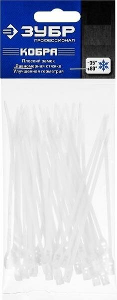 Кабельные стяжки Кобра отличаются от обычных стяжек замком с низким профилем. Плоский замок не оставляет выступов, благодаря чему крепление выглядит более эстетично, повышается безопасность крепления. Стяжки Кобра можно использовать в ресторанных двориках и других местах большого скопления людей; Повышенная морозоустойчивость и термостойкость; Высокая прочность и эластичность; Устойчивость к воздействию горючих и смазочных веществ и большинства химикатов; Диапазон рабочих температур от -35°С до +80°С допускает использование хомутов в самых разнообразных условиях
