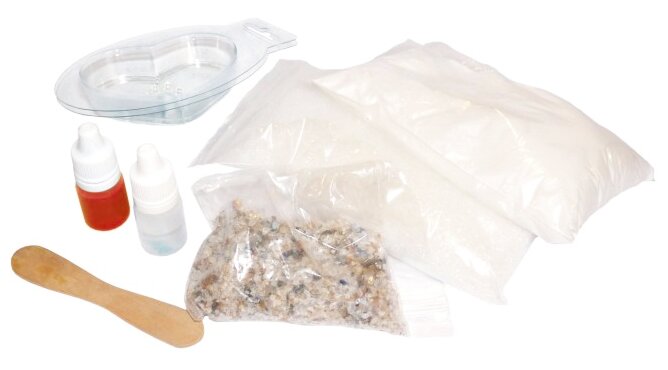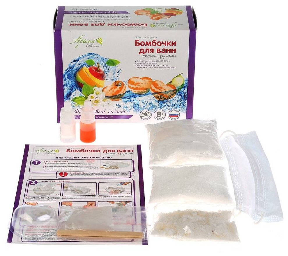 | Состав | ароматизаторы (фруктовый микс), морская соль, лимонная кислота, пищевая сода, пищевой краситель (оранжевый), 2 формочки, палочки для перемешивания, перчатки, одноразовая маска |