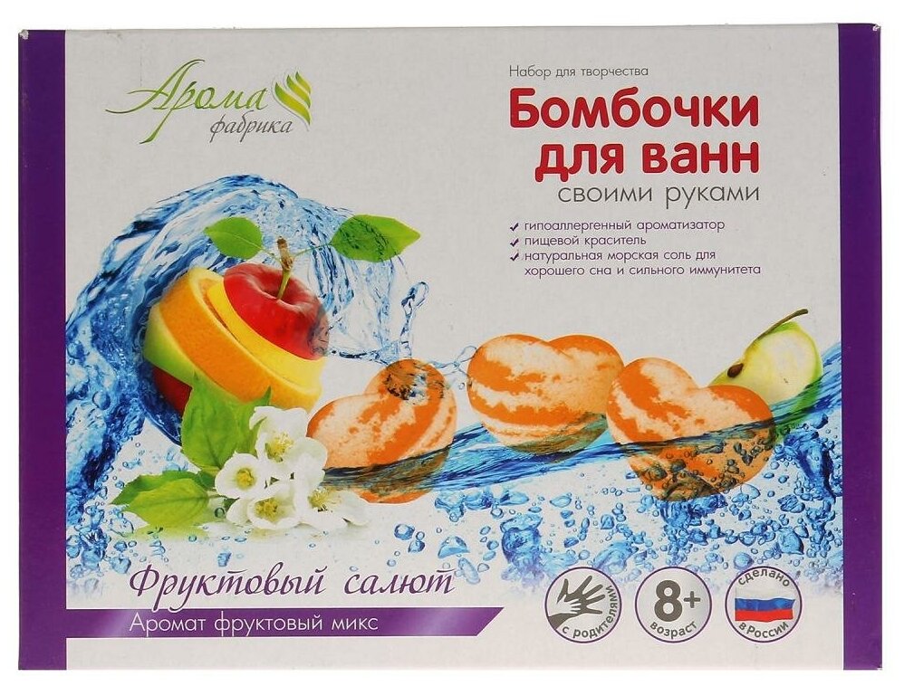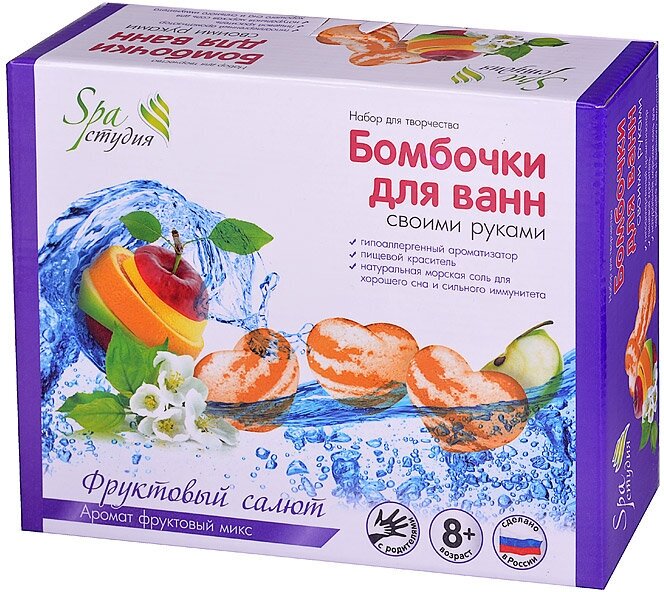 Фруктовый салют от торговой марки Развивашки - это набор для мыловарения, с помощью которого ребенок попробует себя в создании бомбочек для ванн. Для этого ему предстоит воспользоваться предметами и материалами, входящими в комплект, среди которых формочки, натуральная морская соль и красители. Получившийся же продукт будет готов к использованию во время принятия водных процедур.