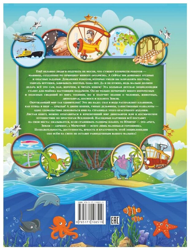 Столько всего нового и интересного можно узнать, прочитав эту книгу! Что такое Вселенная, какие бывают звёзды, как Луна влияет на Землю, почему день сменяет ночь, от чего зависит погода, почему вымерли динозавры, где живут зубастые крокодилы, умные шимпанзе и осторожные зебры, каким был первый велосипед и может ли быть подушка у корабля? С этой энциклопедией у маленького читателя не останется вопросов.