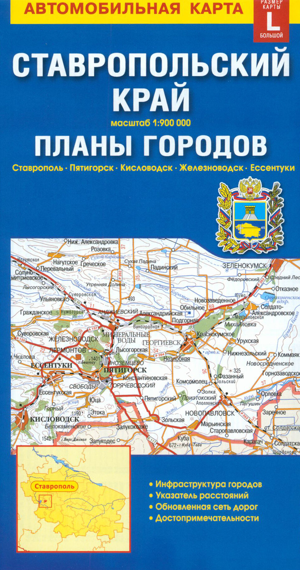Ставропольский край + планы городов. Карта автомобильная, складная 1: 900 000, 1: 12 000