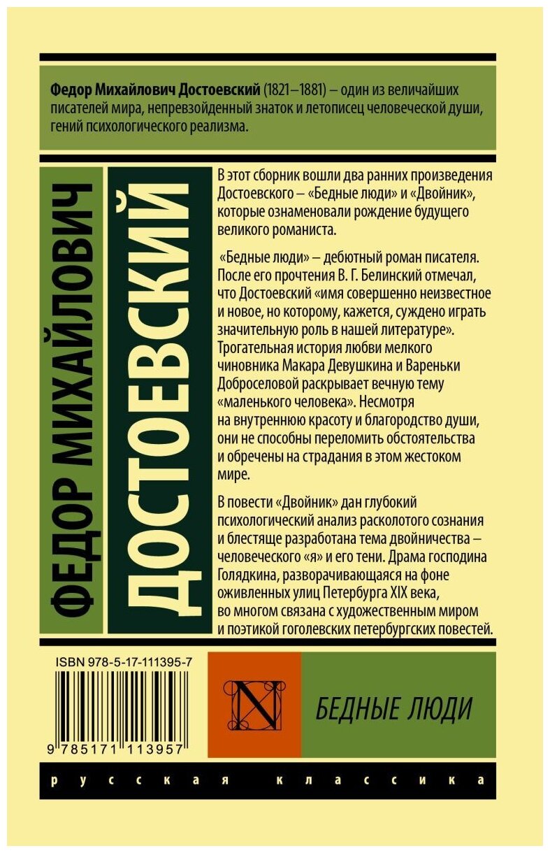 В этот сборник вошли два ранних произведения Достоевского - "Бедные люди" и "Двойник", которые ознаменовали рождение будущего великого романиста.